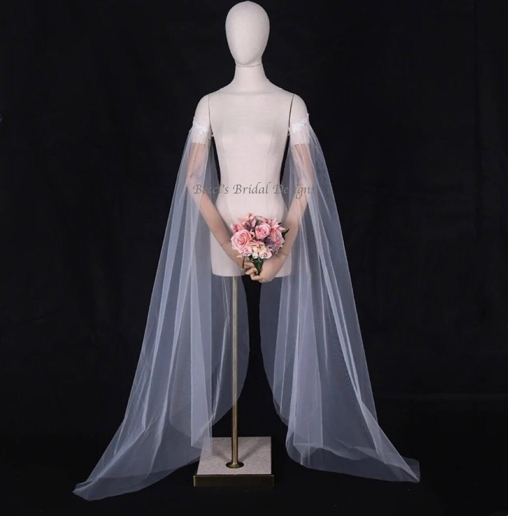 Choose the bicep wedding cape as your wedding dress cape to enjoy both beauty and practicality. Whether you want to add subtle coverage or create dramatic bridal wing sleeves, this versatile piece enhances your bridal outfit while maintaining breathability and ease of movement. Elevate your ceremony look with this soft tulle cape that blends traditional craftsmanship with contemporary design.