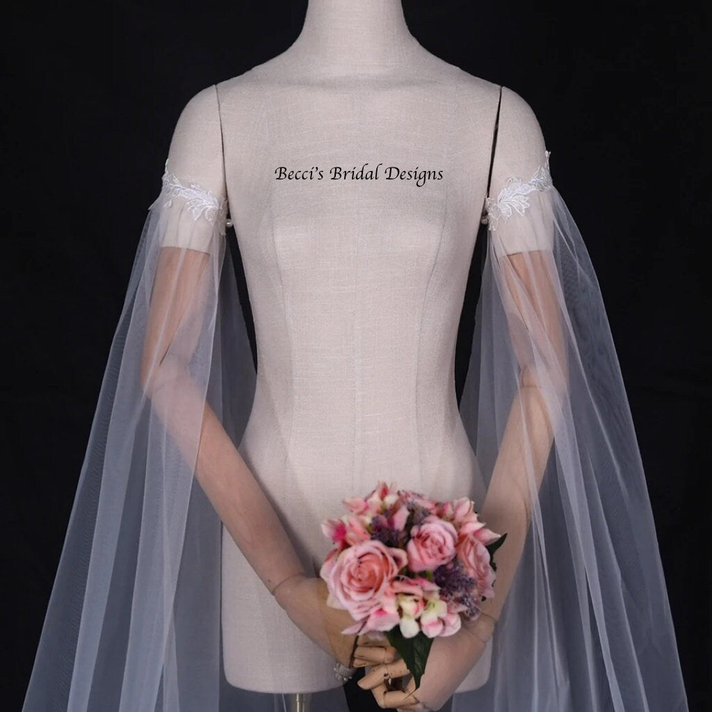 • Handmade soft tulle detachable wedding dress sleeves in two pieces for easy attachment and removal