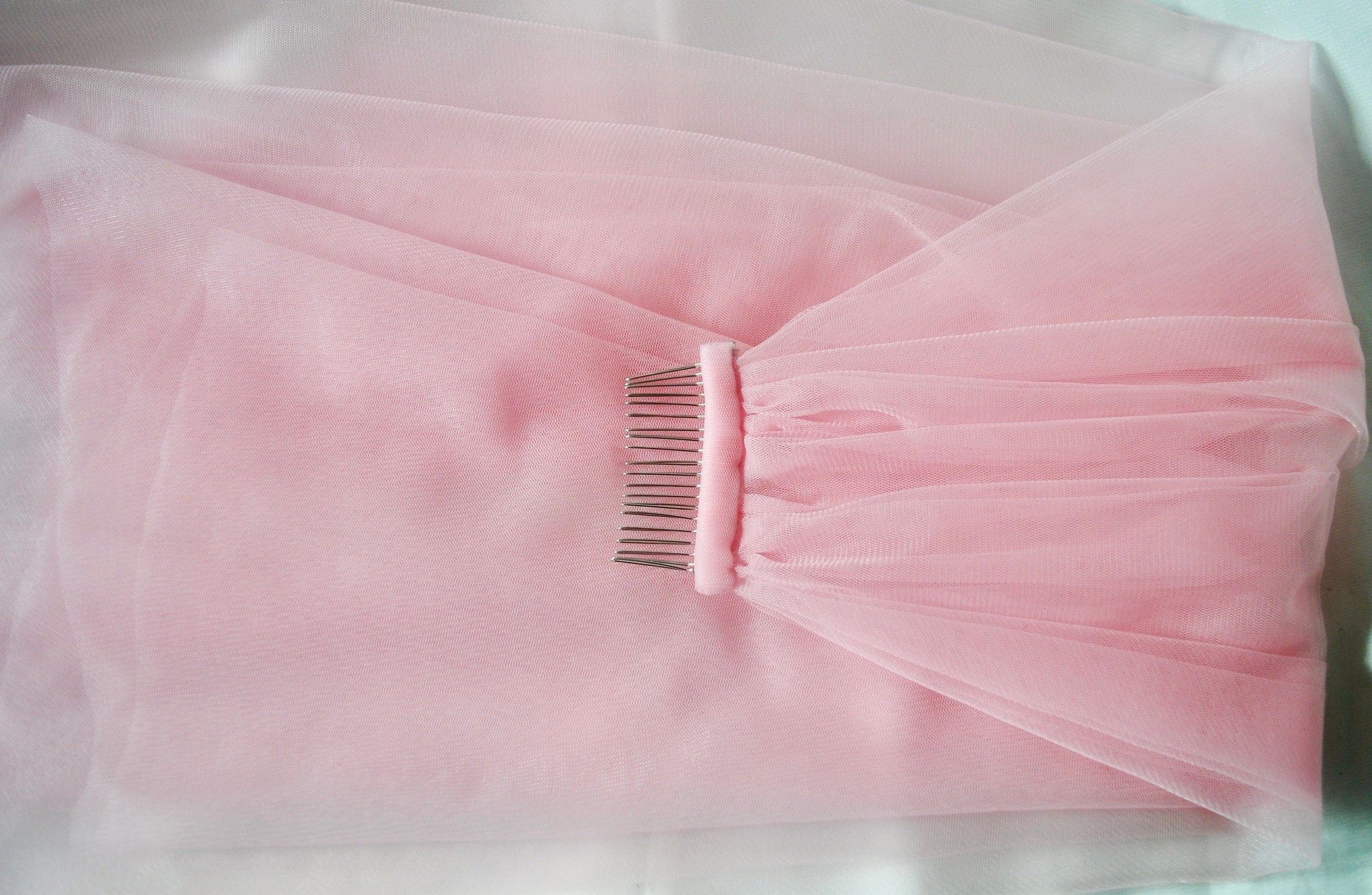 This handmade bridal veil is crafted from soft tulle to create a delicate and elegant pastel pink accessory that enhances your wedding day look. Designed as a fingertip veil measuring 100cm in length, this bridal veil with comb offers a lightweight and comfortable fit that stays securely in place throughout your ceremony. The single-layer soft tulle veil provides a subtle shimmer that complements any bridal gown, making it an elegant bridal accessory for your special day.