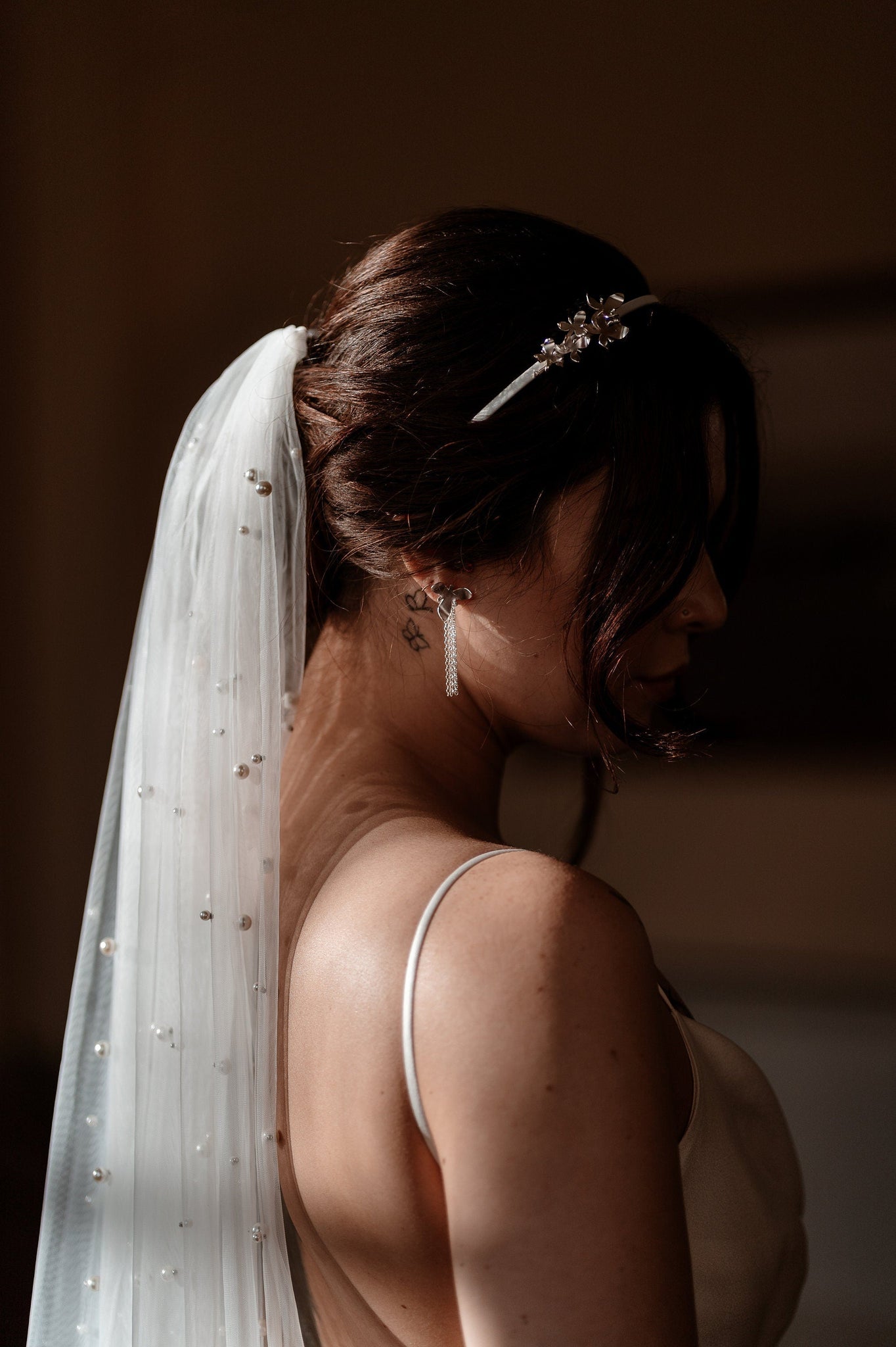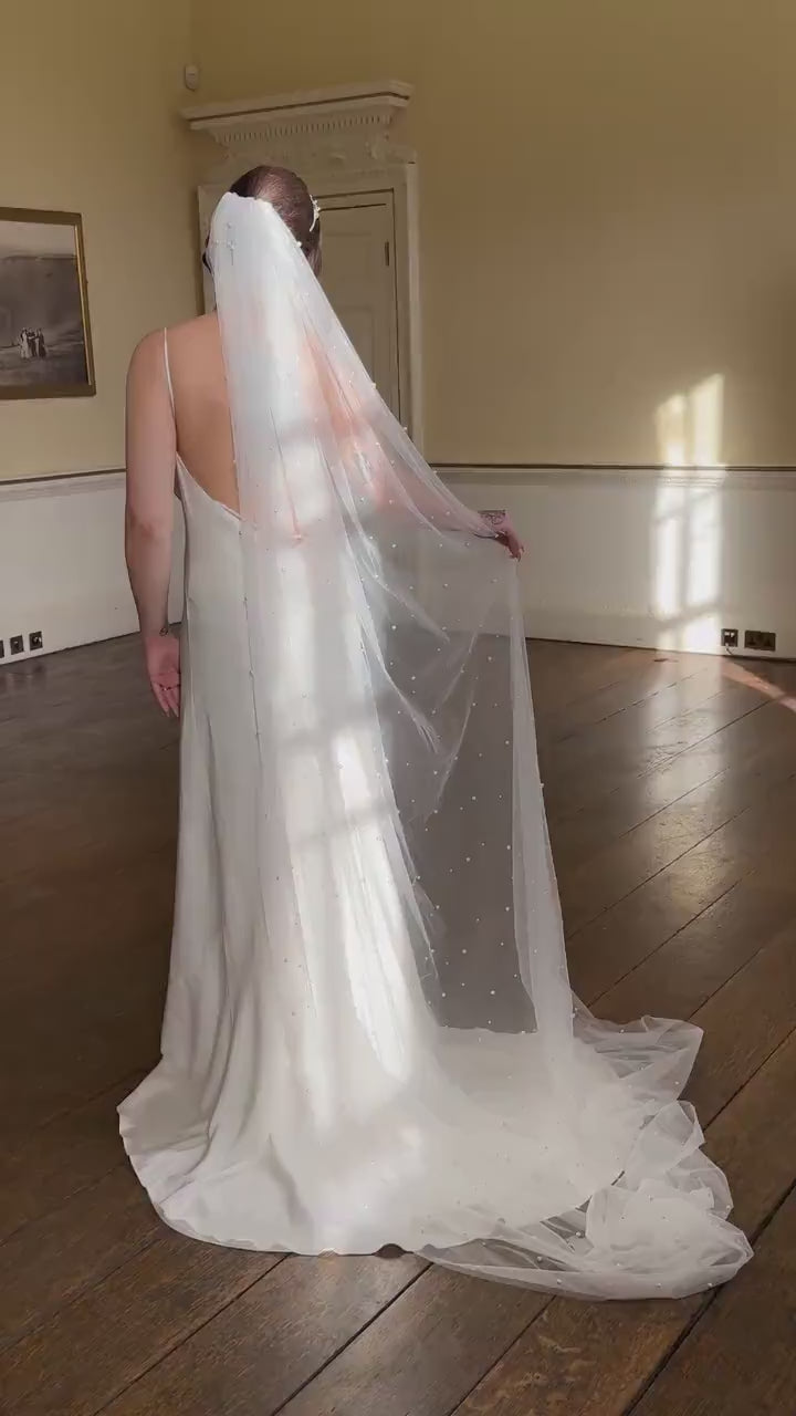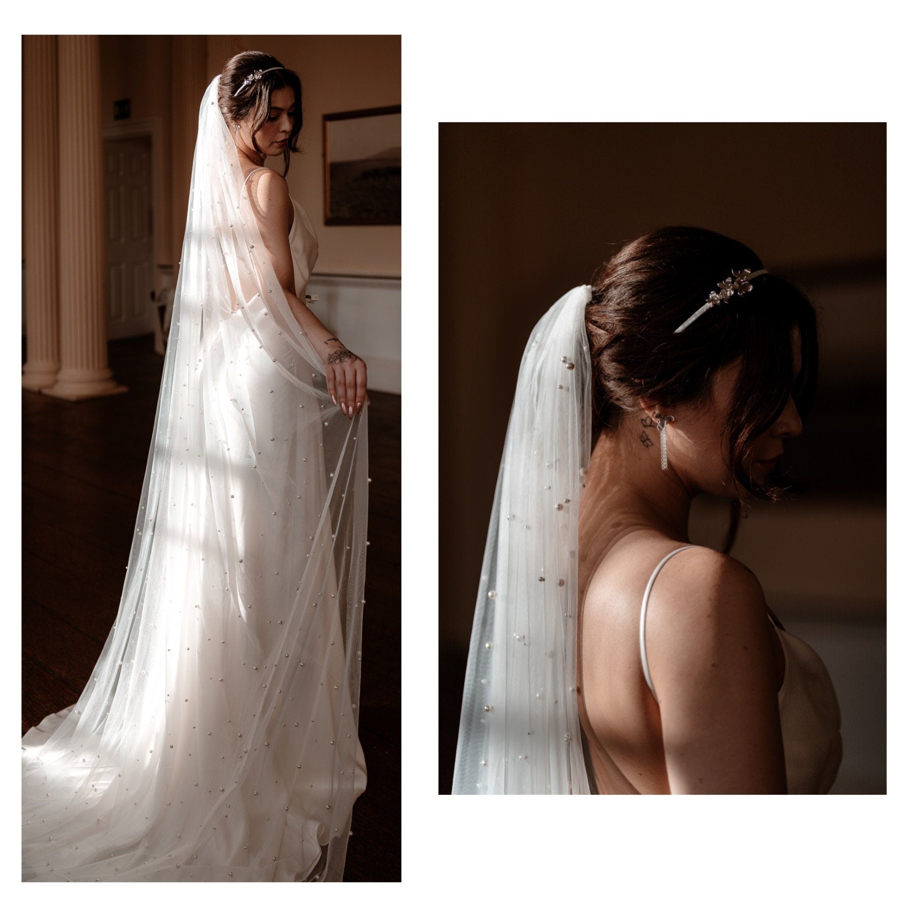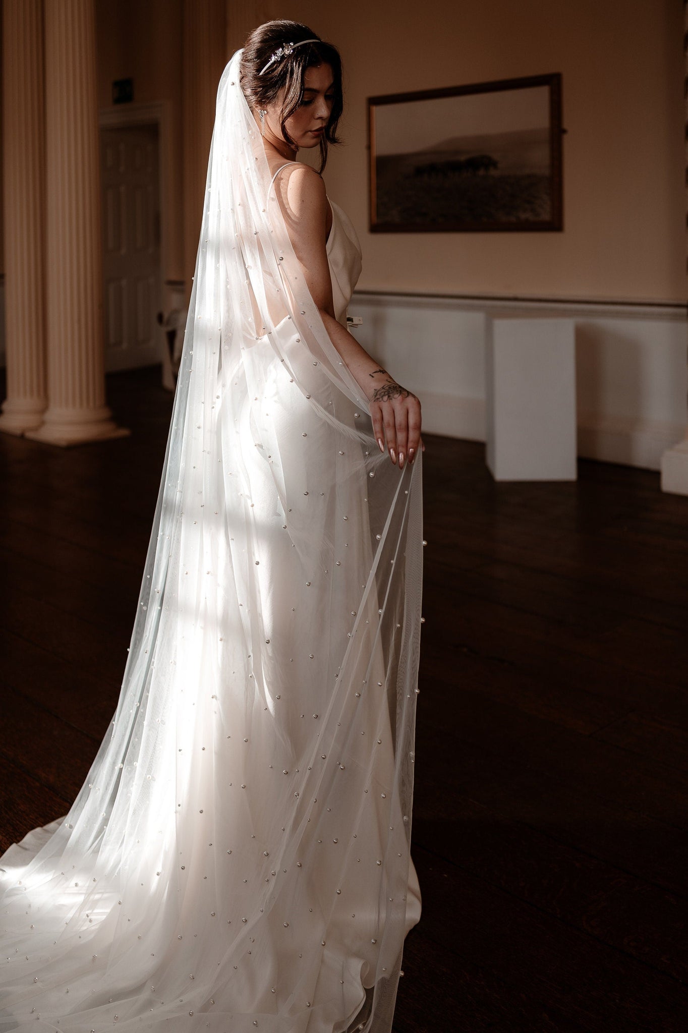 • Scattered pearl embellishments hand-beaded onto the veil for subtle sparkle