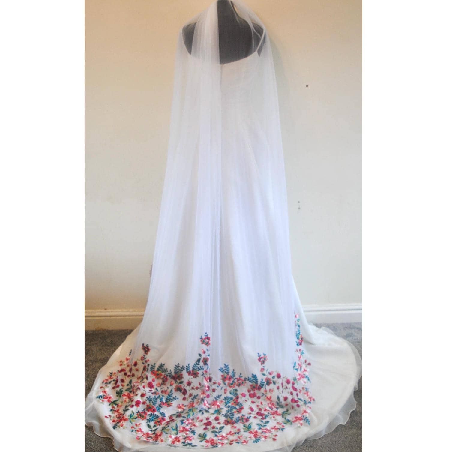 Choose this floral wedding veil to add timeless elegance combined with modern handmade artistry to your bridal ensemble. Whether you desire a cathedral style veil or a soft tulle bridal veil with rose embroidery details, this white wedding veil offers both beauty and function for an unforgettable wedding day look.