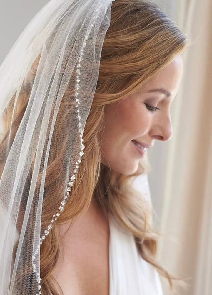 This fingertip length veil measures approximately 36 inches, falling gracefully to highlight your dress while allowing ease of movement. The delicate hand beading along the edges provides an elegant crystal edging effect, elevating the simplicity of this white wedding veil into a refined bridal tulle veil. As an ivory bridal accessory, it complements a variety of wedding gowns and styles, from classic to modern.