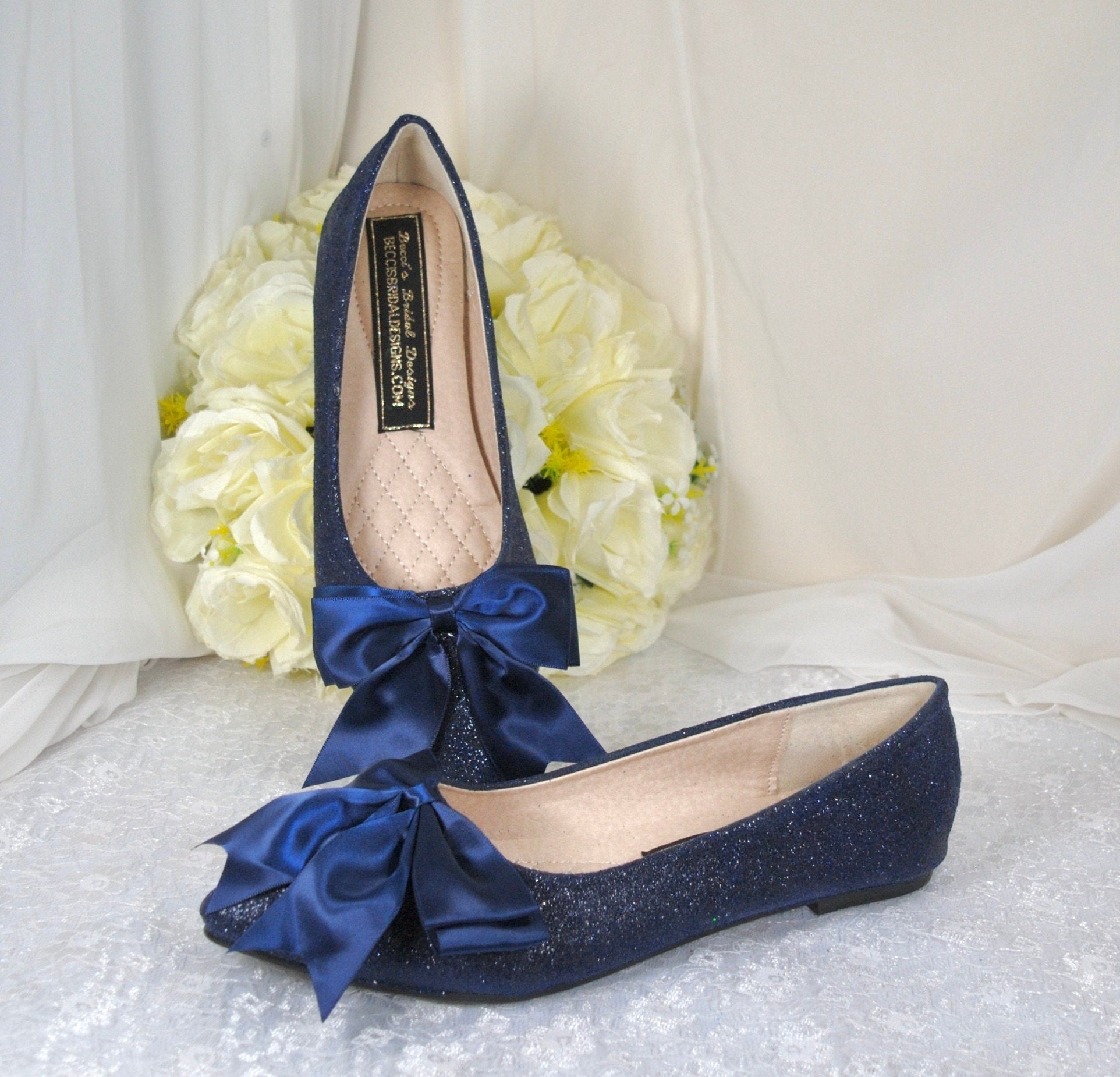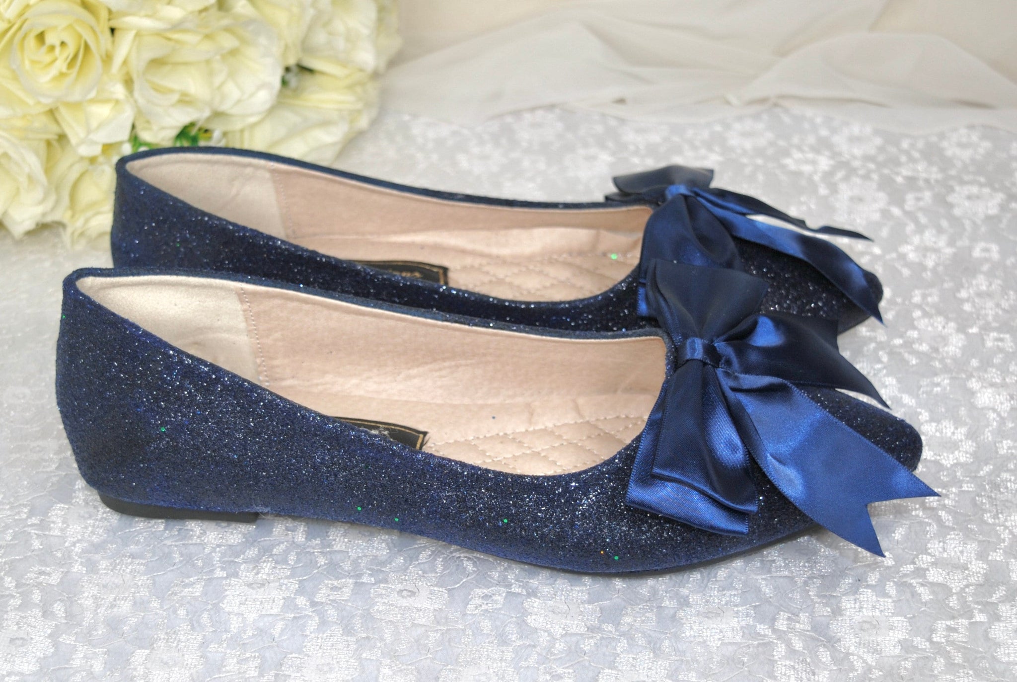 Navy blue bridal flats designed for comfort and style offer the perfect choice for your special day. These handmade bridal shoes feature a cushioned sole that ensures all-day comfort, making them ideal custom colour wedding shoes for brides, bridesmaids, and wedding guests. With a flat heel and an elegant pointed toe, these comfortable satin flats combine practicality with sophisticated design. The glitter ballet flats showcase an oversized satin bow that adds a charming touch to your wedding flat footwear.