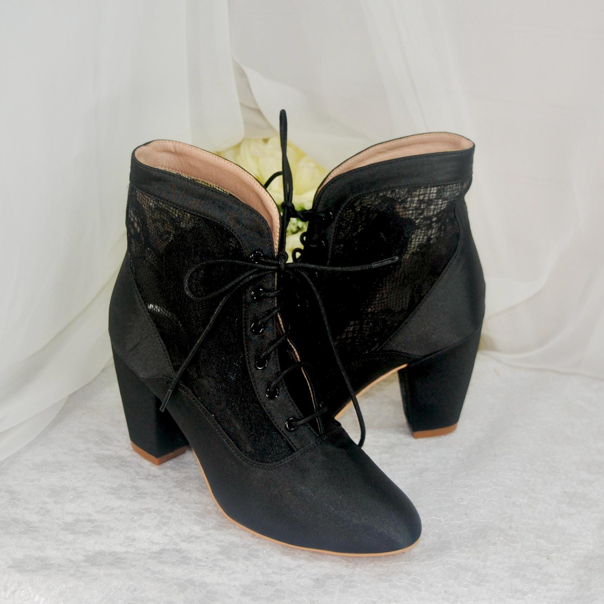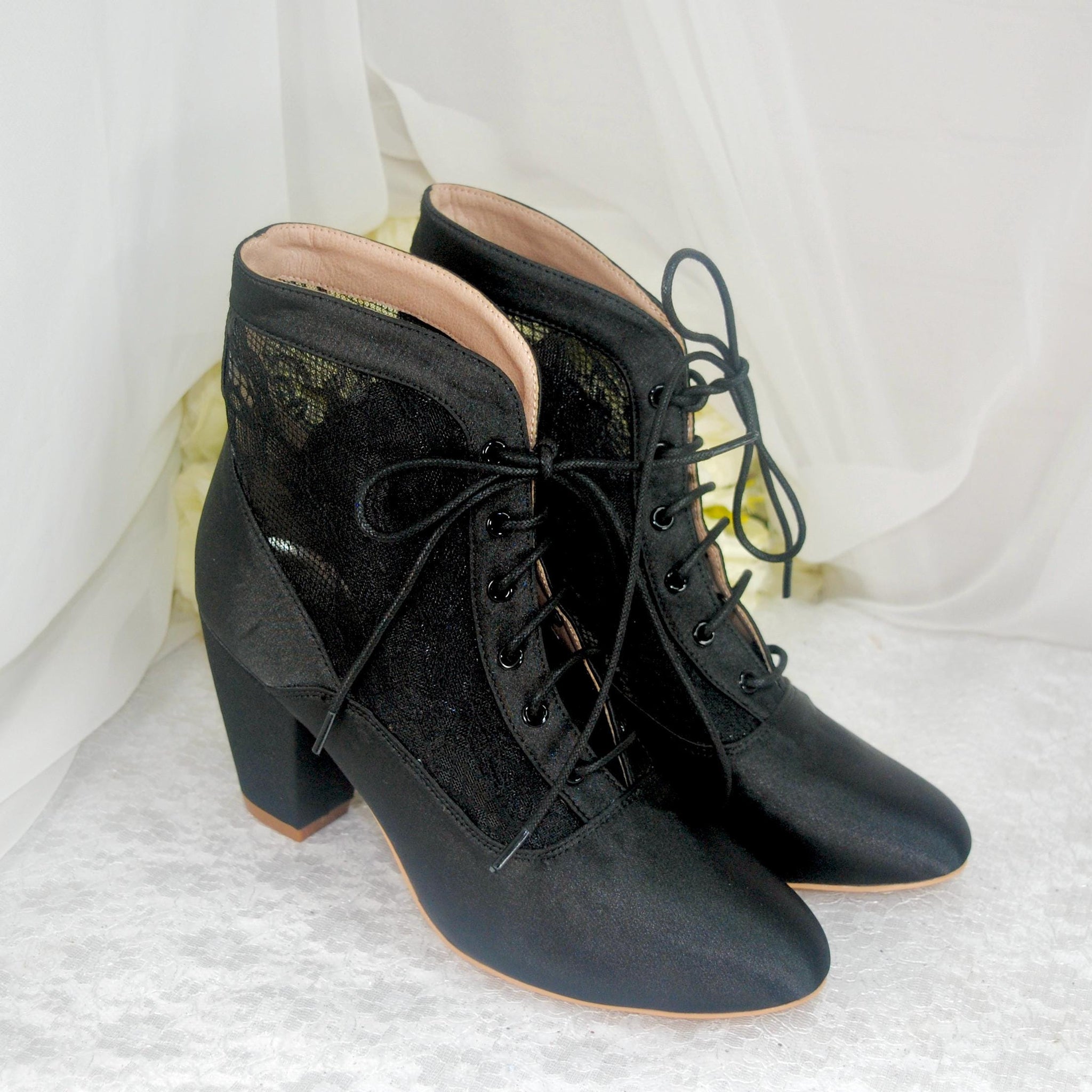 Black satin ankle boots crafted with delicate lace overlays define these handmade bridal block heel boots, designed to offer both style and comfort for vintage wedding shoes lovers. These gothic bridal shoes feature an 8cm block heel that ensures stability and ease during long events, while the padded memory foam insoles provide comfortable wedding footwear support all day. Handmade bridal boots like these combine classic bridal footwear elegance with a unique alternative bridal shoes design, perfect for brides seeking custom wedding boots that stand out.