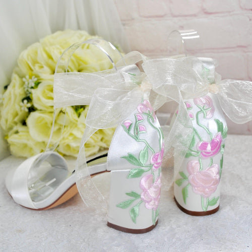 Bridal Block Heel Sandals – Handmade Satin Wedding Shoes With Pastel Floral Embroidery • UK5/US7.5