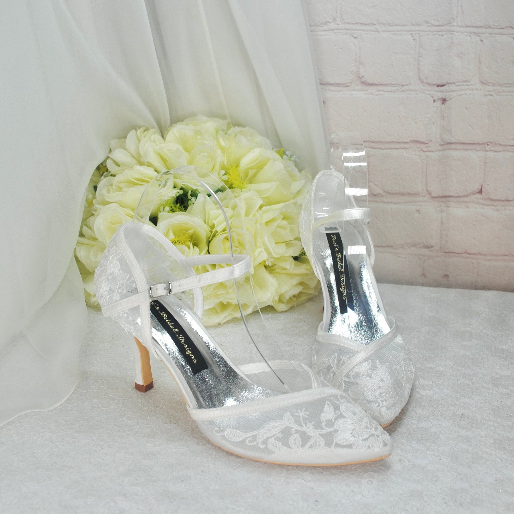 Bridal White D'orsay Lace Embroidered Kitten Heel Wedding Shoes UK5 / US7.5
