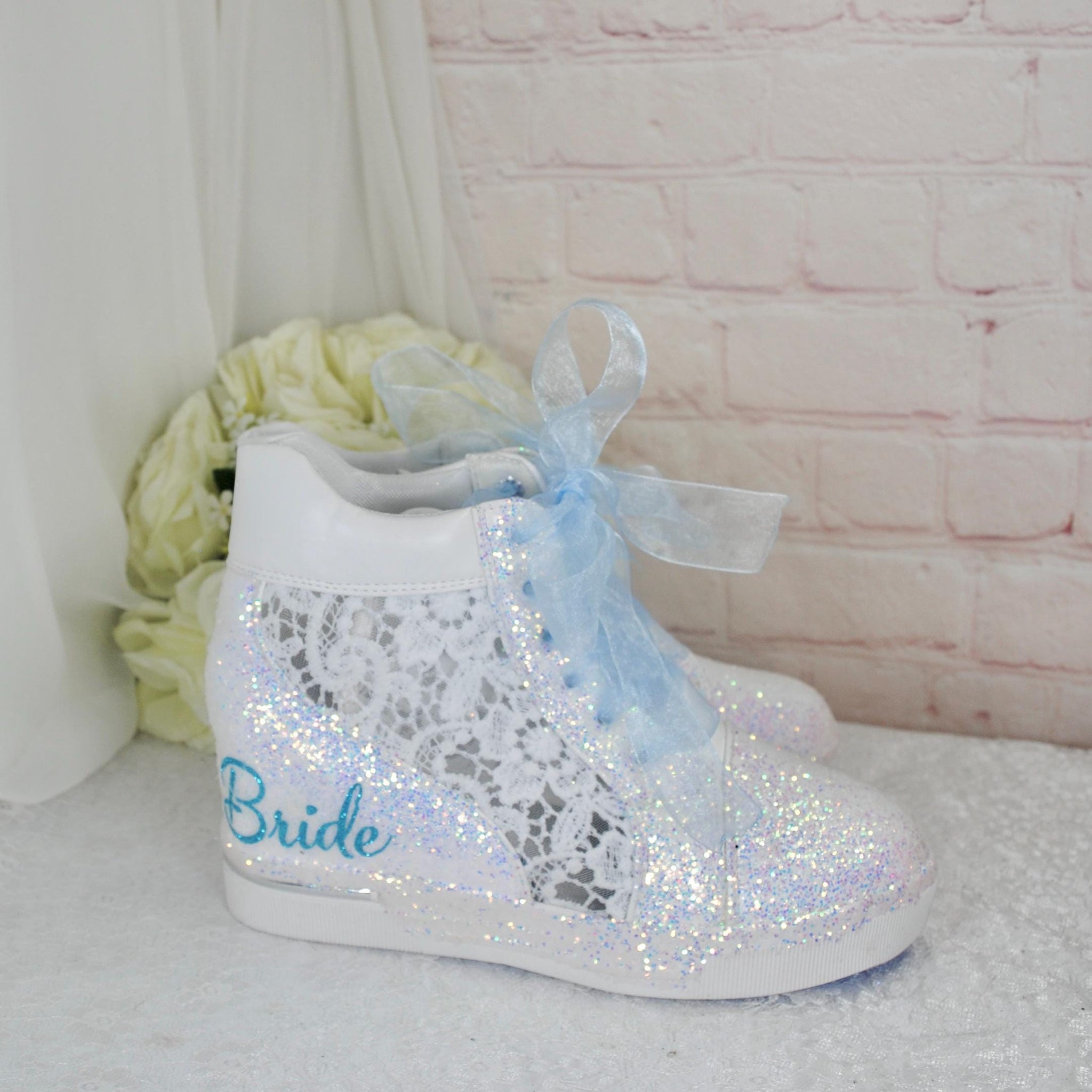 Our Glitter Bridal Wedge Sneakers are the perfect bridal wedge sneakers designed to offer a comfortable alternative to traditional wedding shoes, ensuring the bride enjoys her special day with style and ease. These white glitter sneakers feature a 3-inch wedge heel that adds height without sacrificing comfort, making them ideal for brides seeking both elegance and practicality. Crafted with breathable mesh lace sides and delicate organza ribbon laces, these lace bridal trainers combine beauty and functionality effortlessly. The iridescent white glitter finish and blue soles provide a unique Something Blue detail that complements any wedding dress.