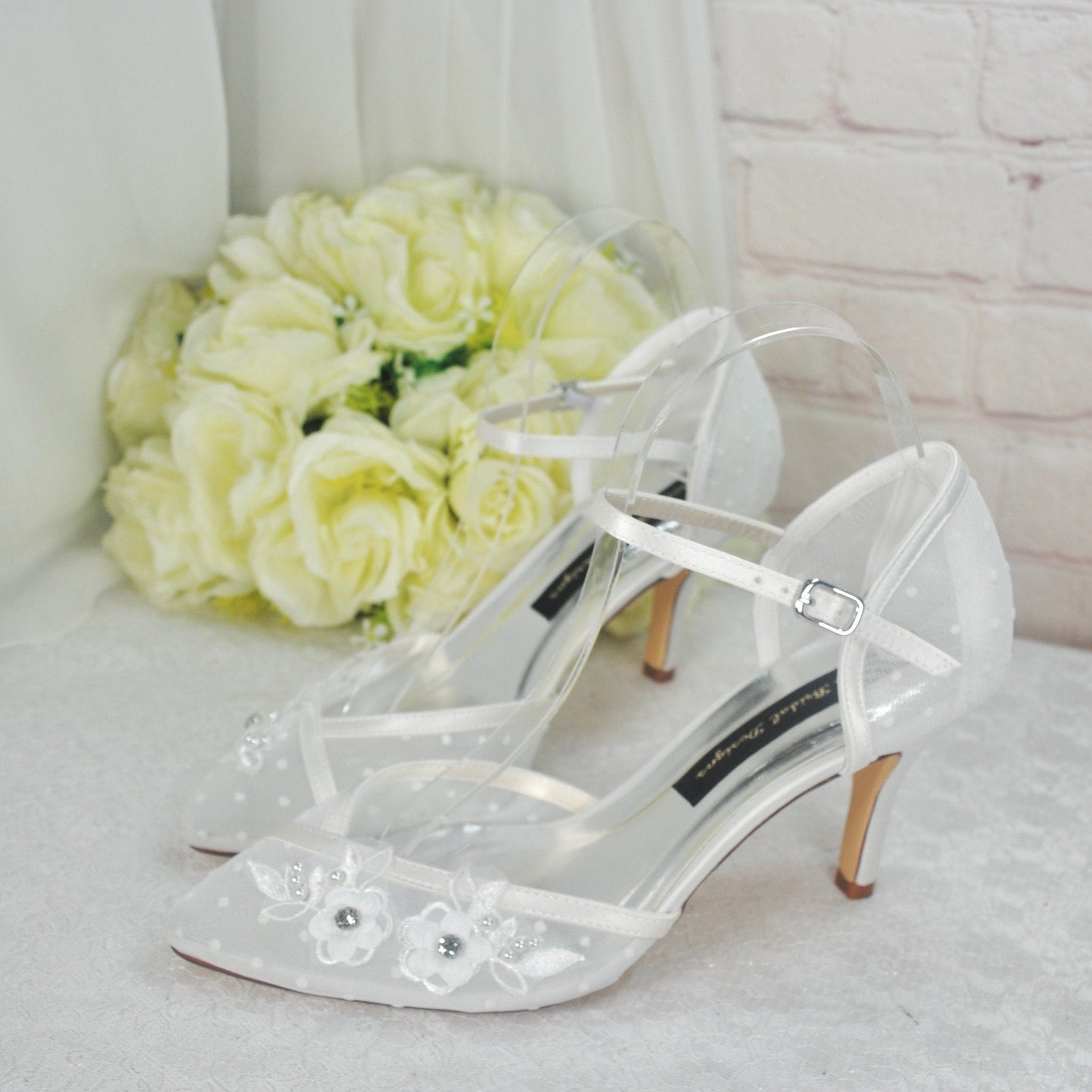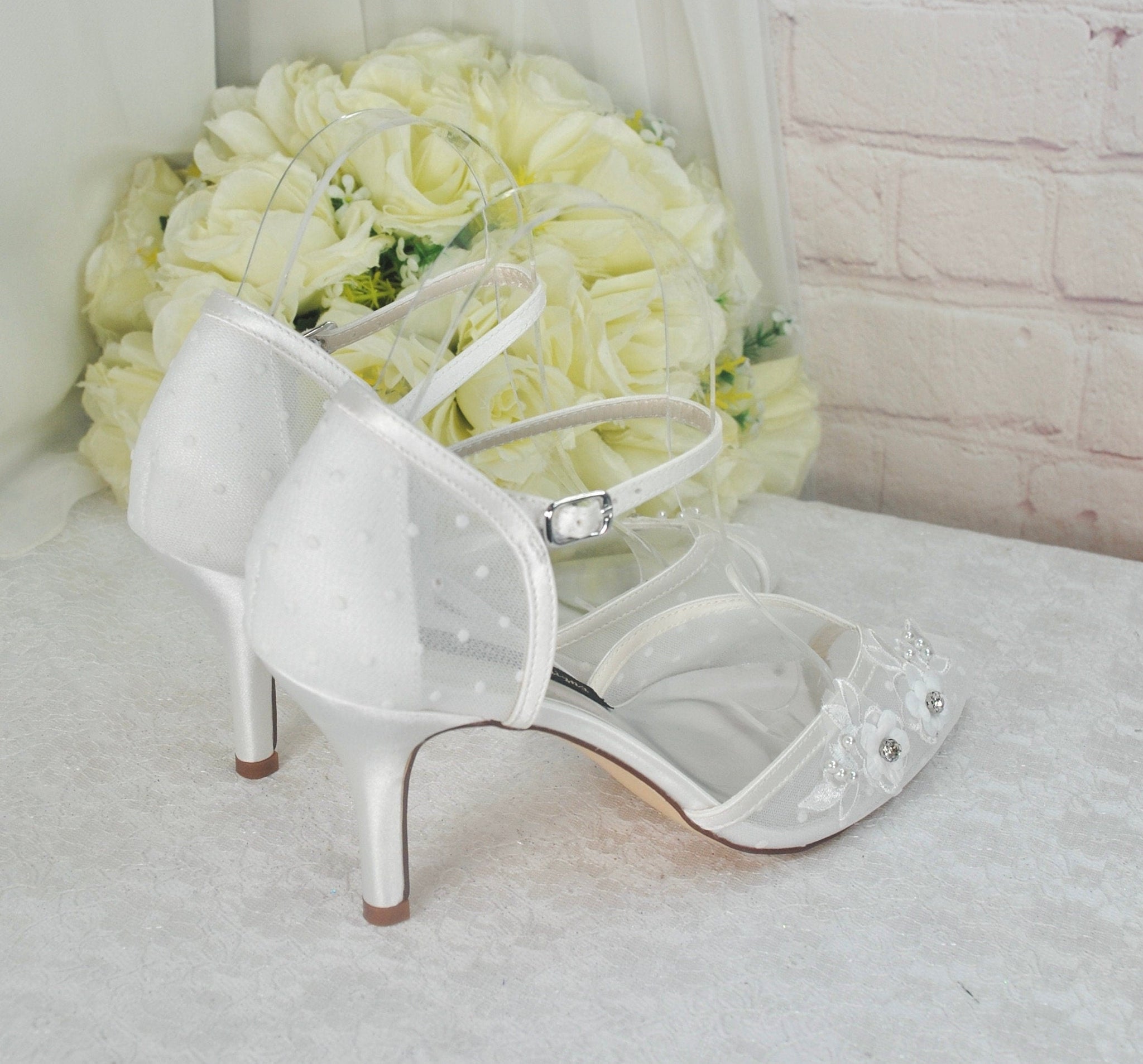 Ivory satin bridal sandals offer elegant comfort and style for your special day, designed to enhance every bride's wedding look while ensuring all-day wearability. These handmade satin shoes feature cushioned soles with wedding shoe padding that reduce foot fatigue, allowing you to celebrate comfortably from ceremony to reception. Crafted by Becci's Bridal Designs, these bridal ankle strap shoes combine delicate hand-beaded floral details with an 8cm heel height, providing the perfect balance of grace and support.