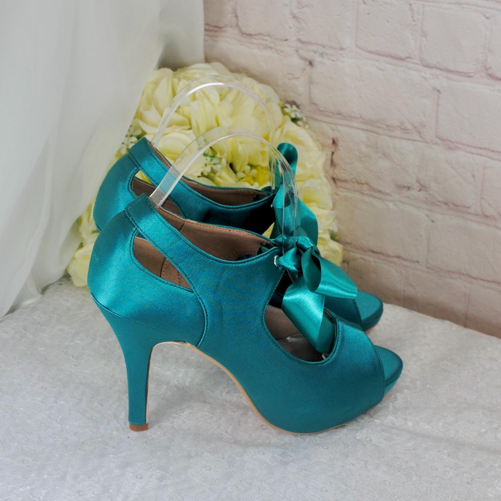Teal Green Peep Toe Bridal Booties: Satin Heeled Boots, Wedding Shoes