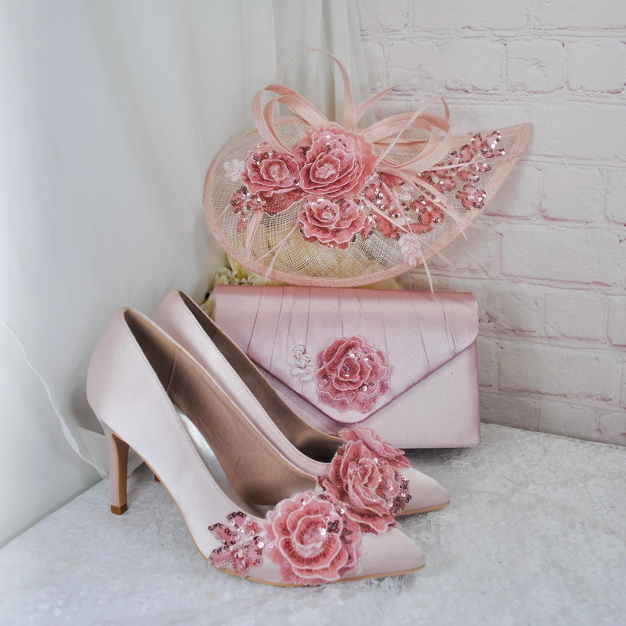 These floral embroidered heels come in a stunning pink shade and are part of a complete bridal shoe set, including a matching pink satin clutch bag and fascinator hat available separately to perfectly coordinate your wedding guest accessories. Each pair is carefully crafted by hand and packaged in eco-friendly luxury shoe boxes, double boxed to ensure safe delivery.