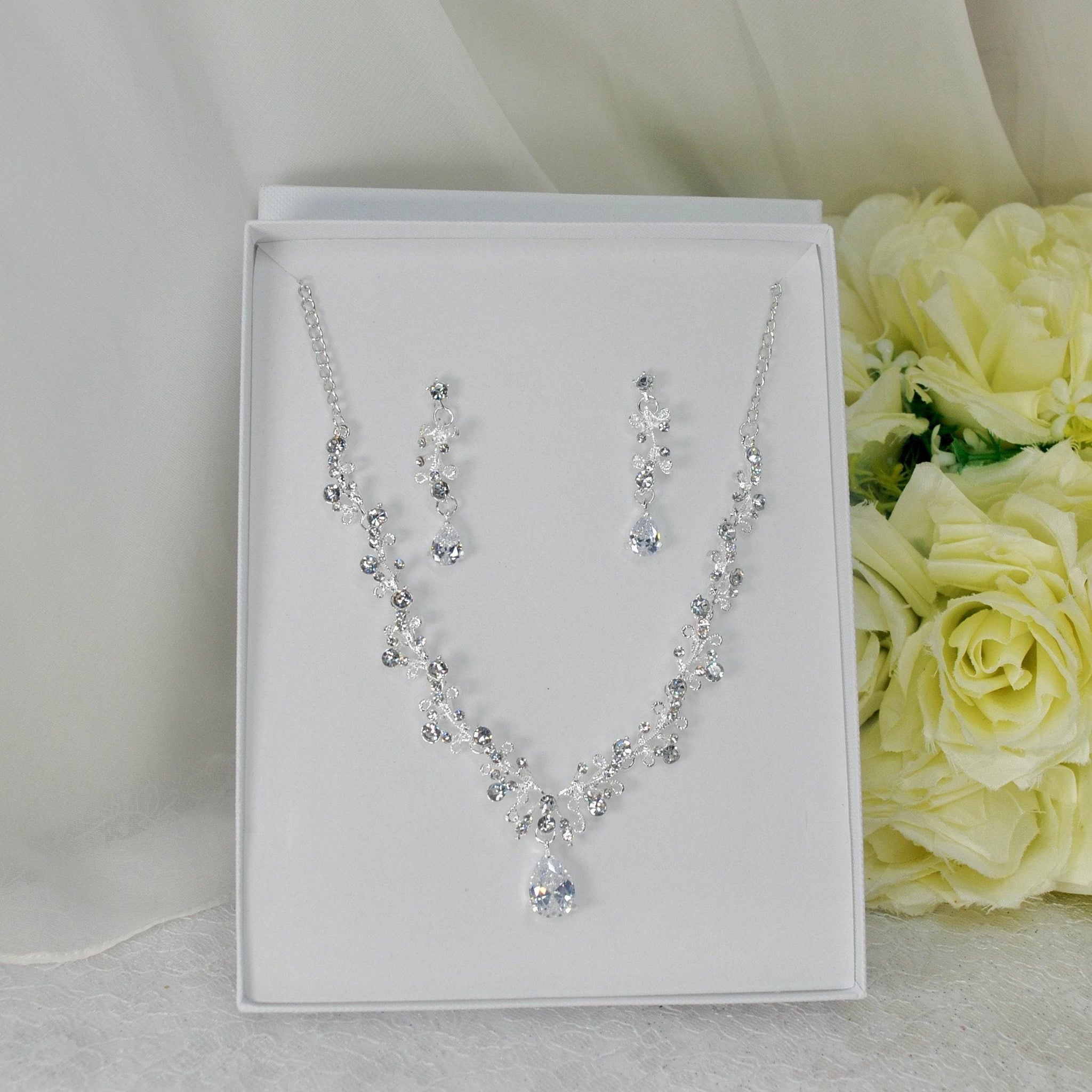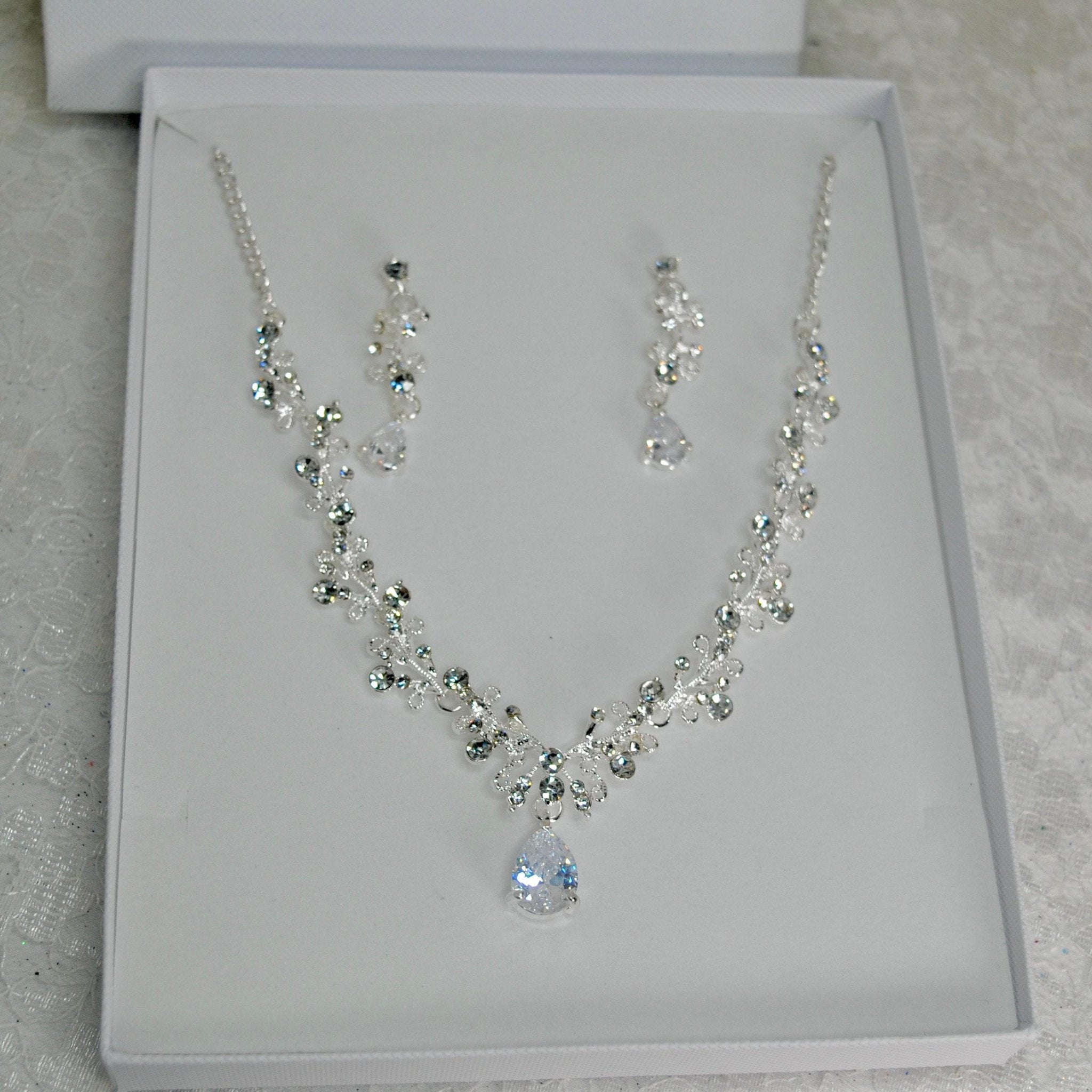 This bridal jewelry set features a teardrop cubic zirconia necklace and earrings designed to add a sparkling touch to your wedding day look. The bridal jewelry set offers a diamond look necklace and matching bridal drop earrings, creating an elegant ensemble that enhances your bridal accessories collection. Crafted from silver plated jewelry with shimmering cubic zirconia crystals, this wedding jewelry set delivers the perfect balance of beauty and lasting shine for brides, bridesmaids, or as a gift boxed jewelry option.