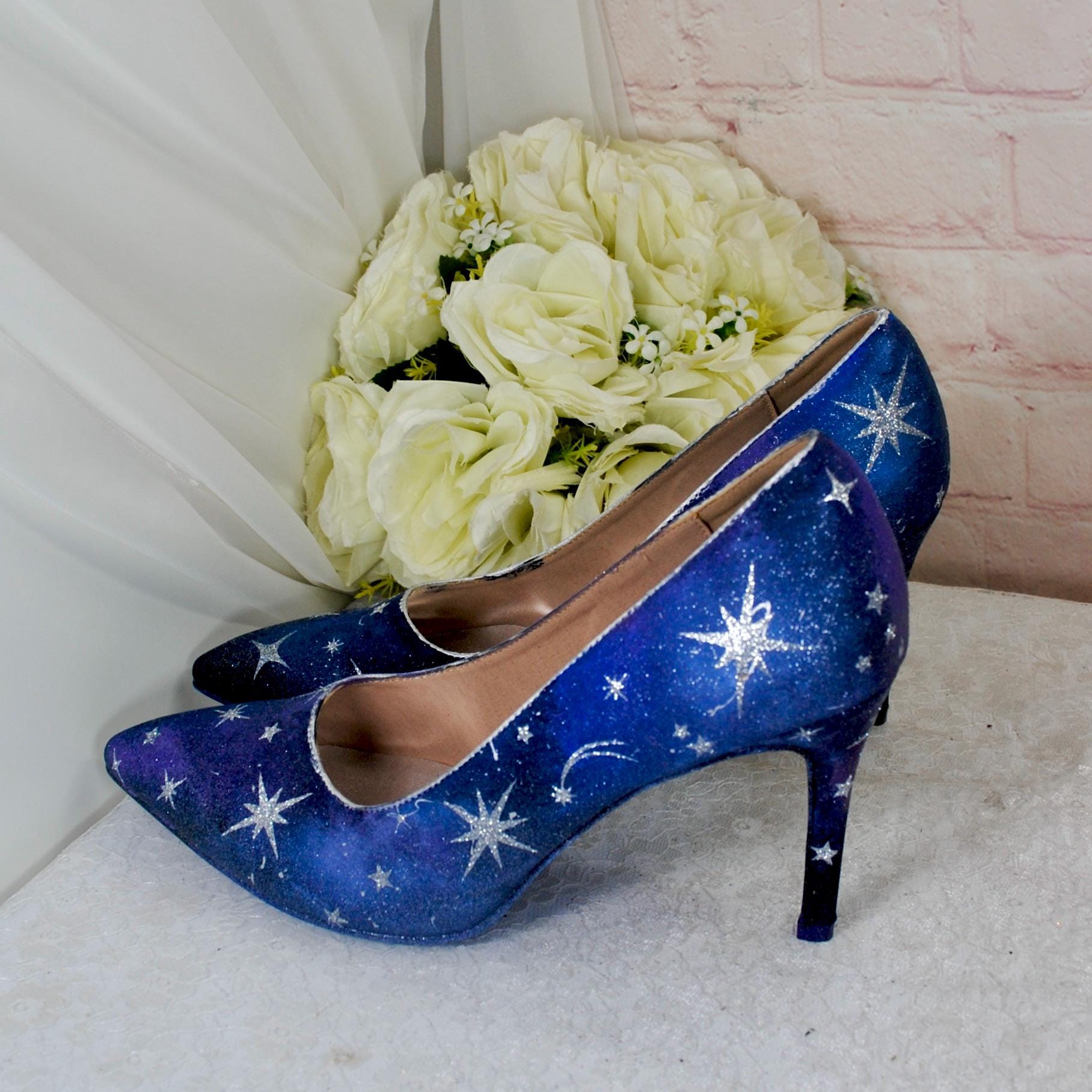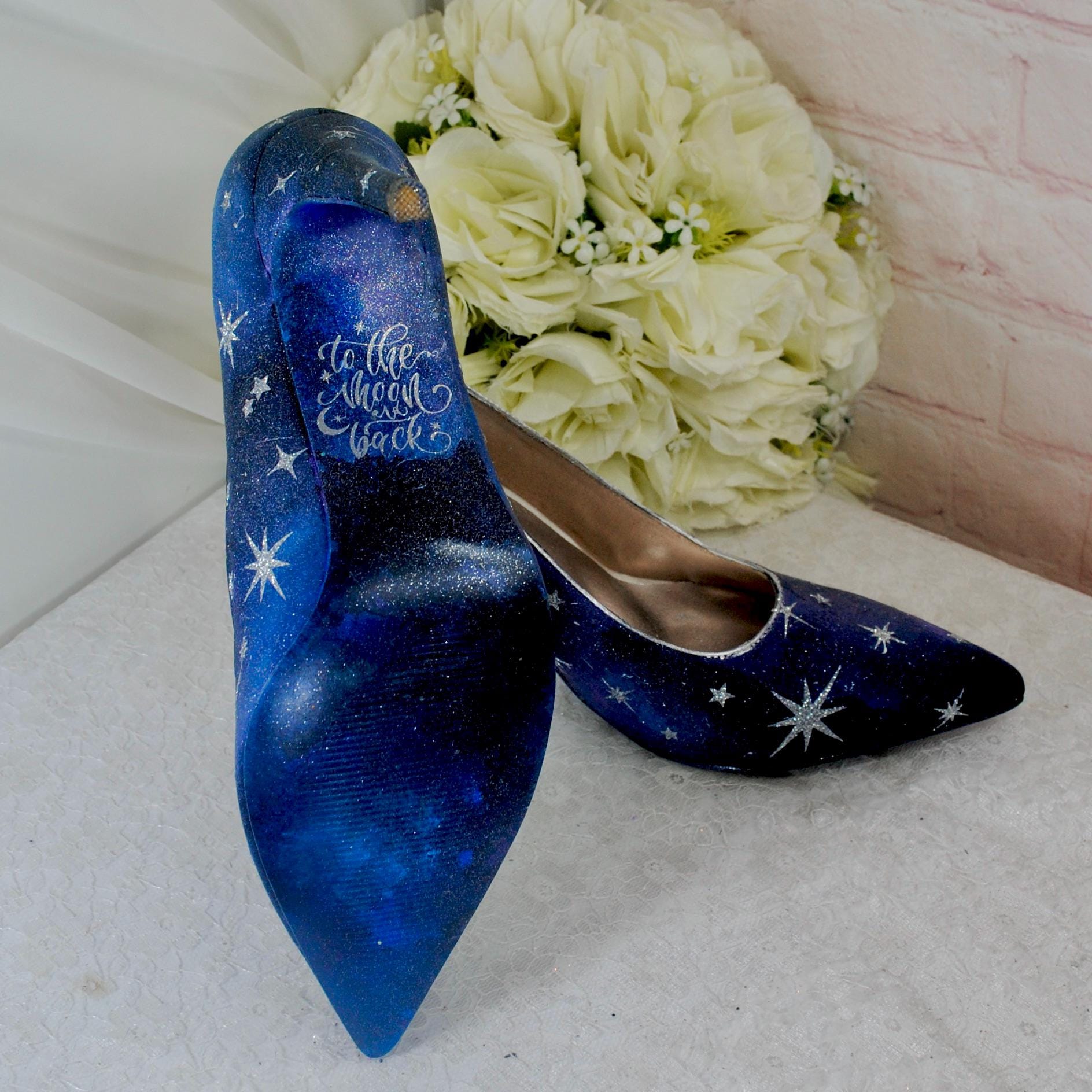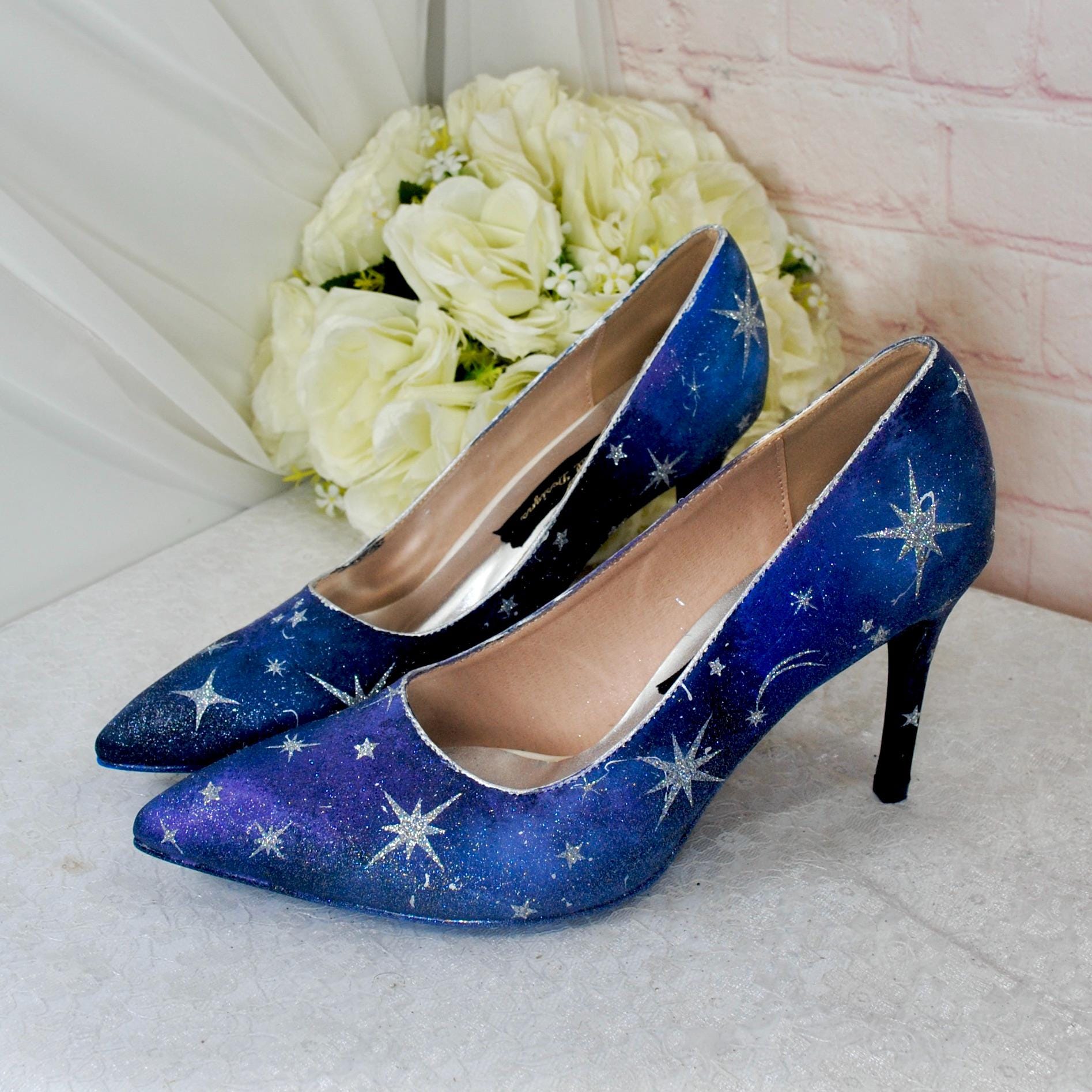 Celestial Wedding Shoes - Handmade Bridal Shoes that are Beautifully Hand Painted in a Galaxy Pattern and finished with Silver Glitter Stars and a over all shimmer.