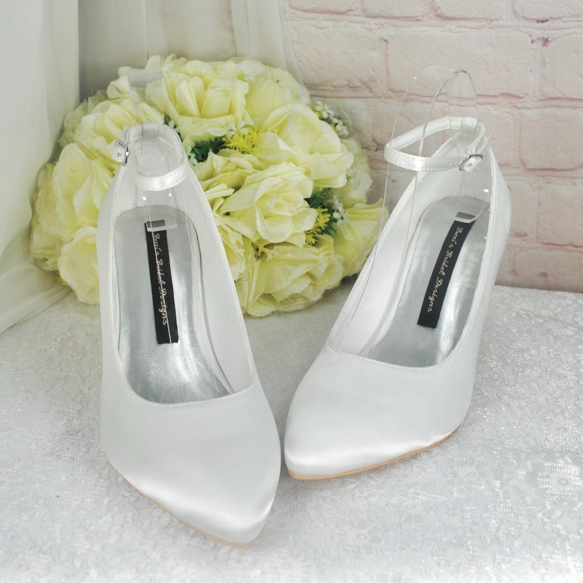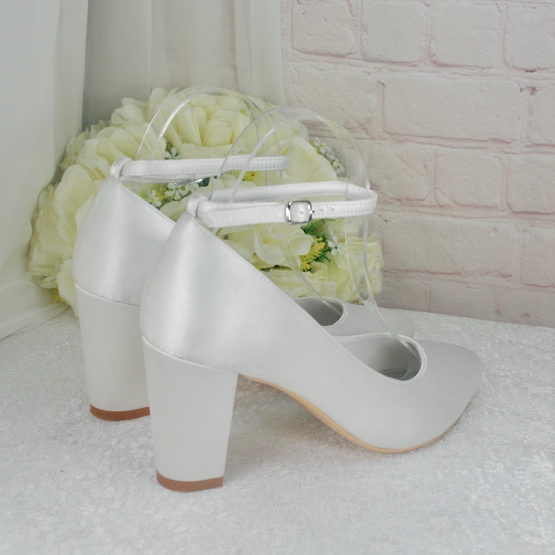 Our bridal block heel shoes are expertly crafted to offer style, comfort, and elegance for your special day. These white bridesmaid shoes with ankle strap combine a 7.5cm block heel and pointed toe design to provide stability and sophistication, making them perfect for weddings and evening events. Handmade satin heels deliver a luxurious finish, while cushioned insoles ensure comfortable wedding shoes you can wear all day. Available in size UK9/US11, these white bridal heels are designed to complement classic wedding footwear needs.