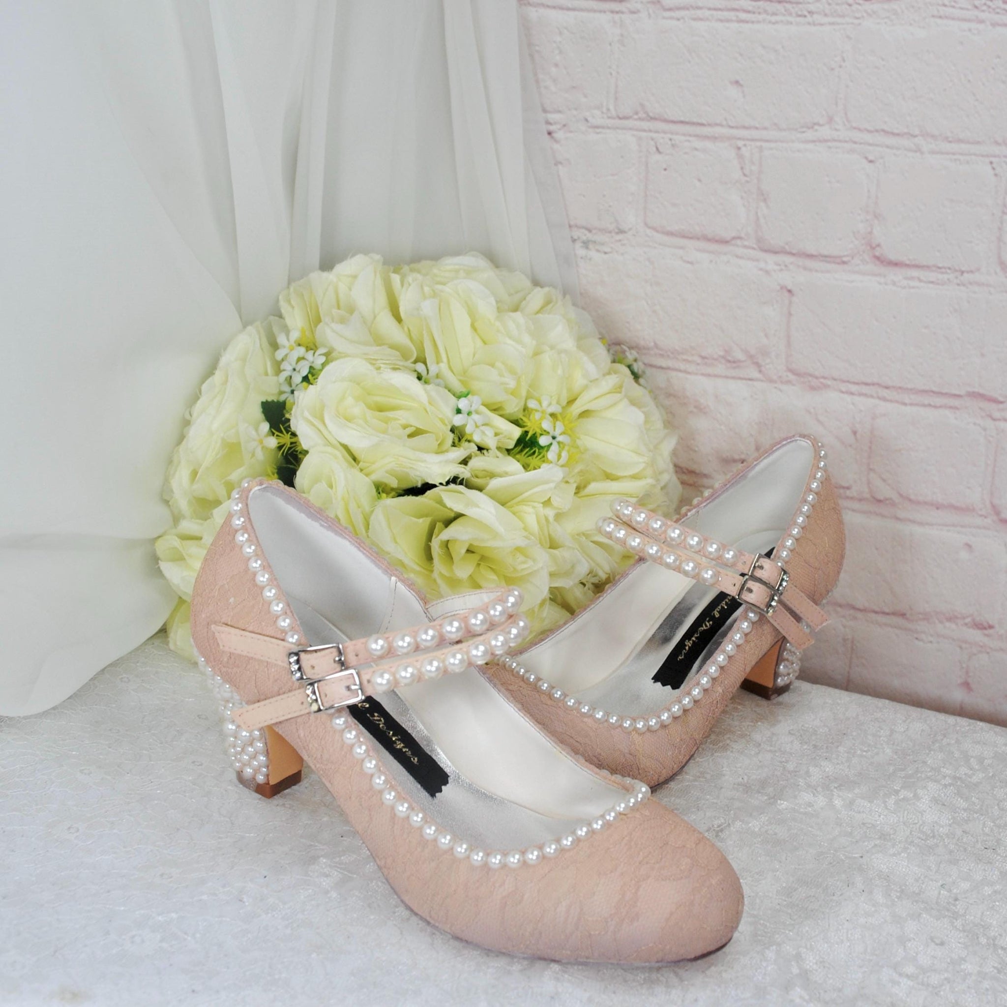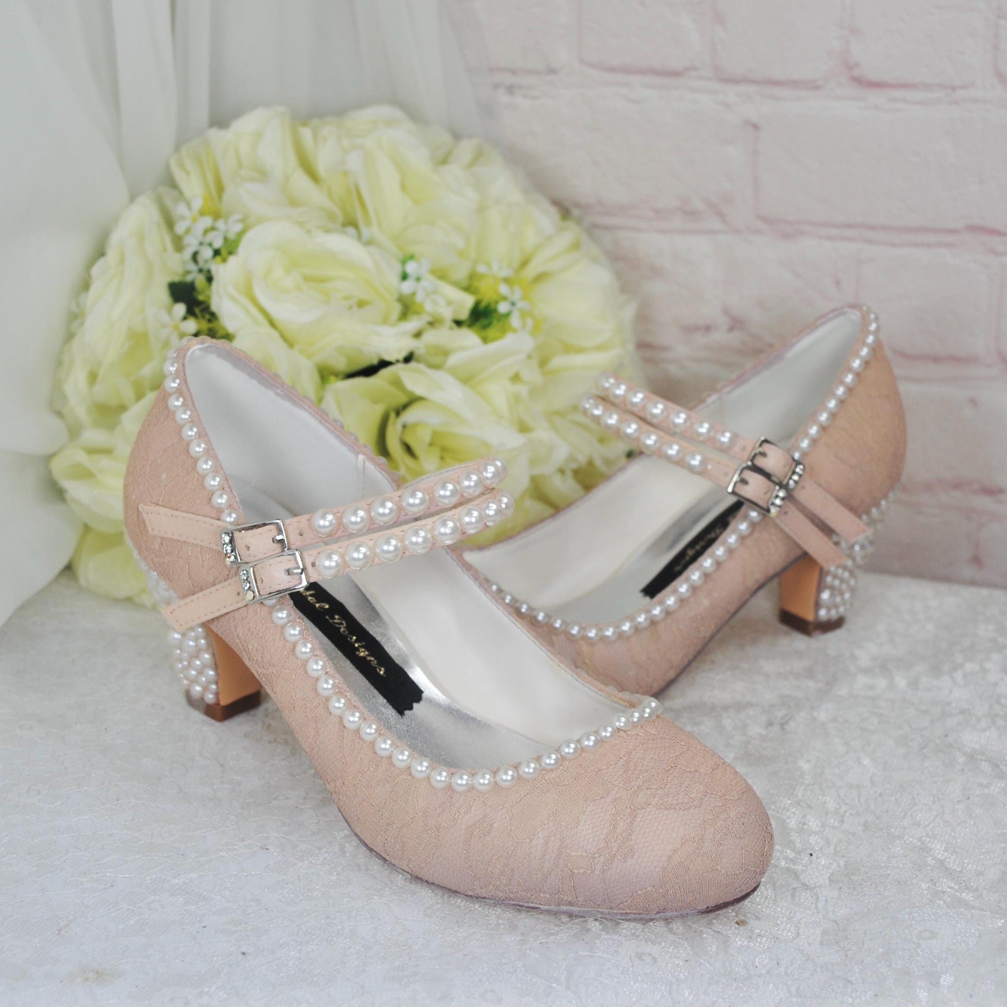 Champagne bridal shoes crafted with handmade satin and a delicate lace overlay, these vintage Mary Janes offer an elegant choice for your wedding day. Featuring a comfortable 8cm block heel, these lace pearl heels provide bridal shoe comfort that lasts all day. Designed to blend classic style with modern comfort, these bridal block heel shoes ensure you look stunning