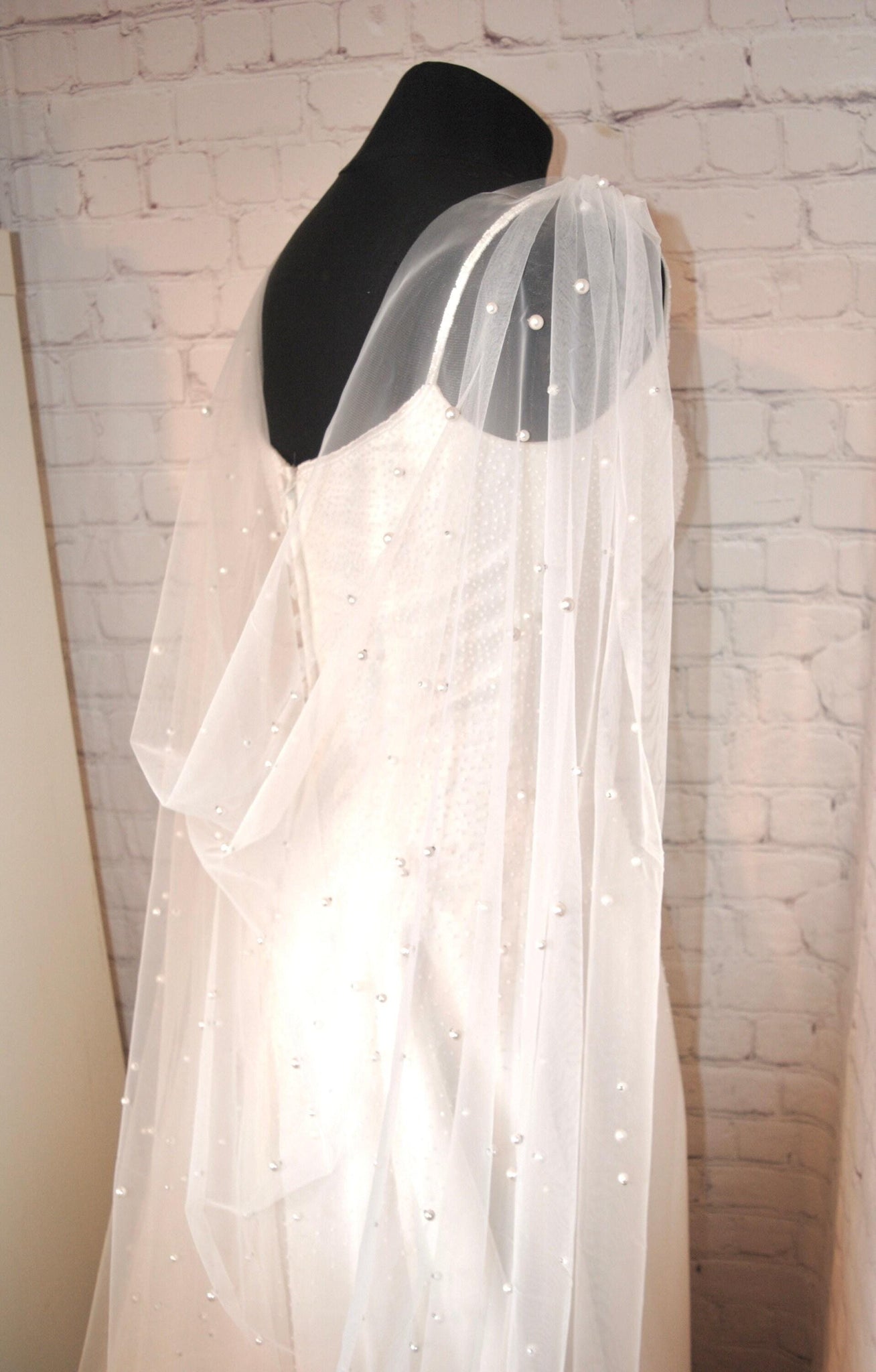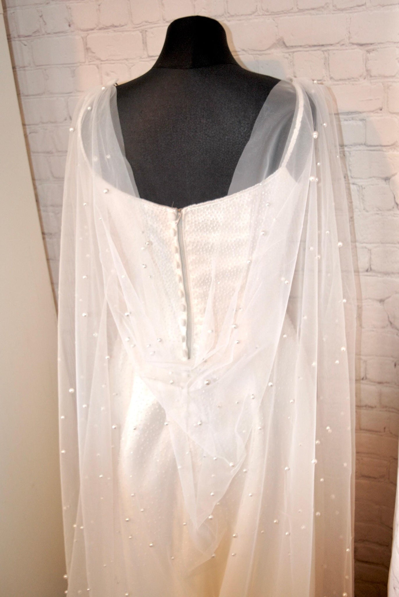 The cape attaches onto your dress straps with small clips under each end. This veil has a raw edge and the hem is cut to a semi circle. The tulle has a gorgeous drape giving it a floaty feel.