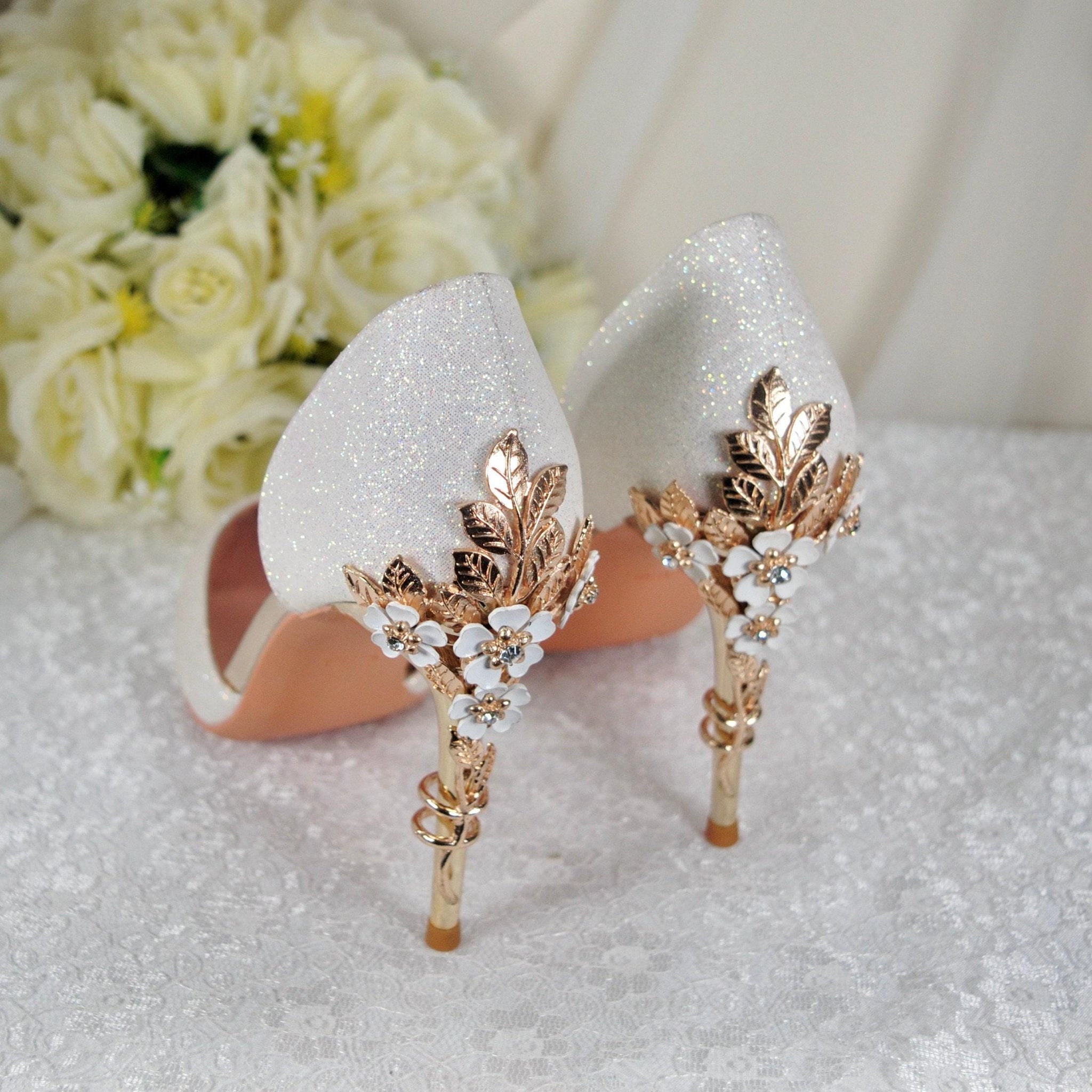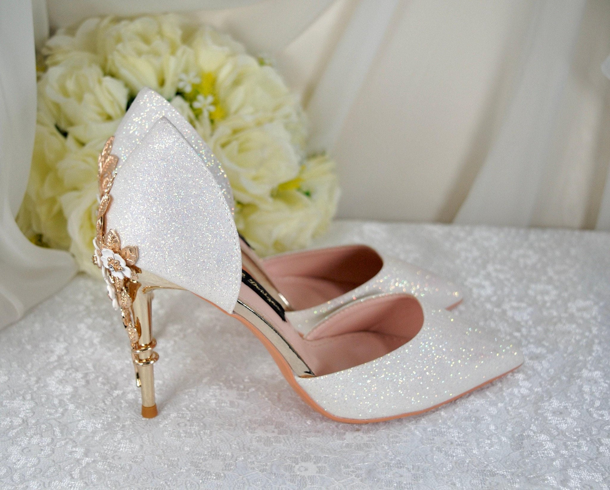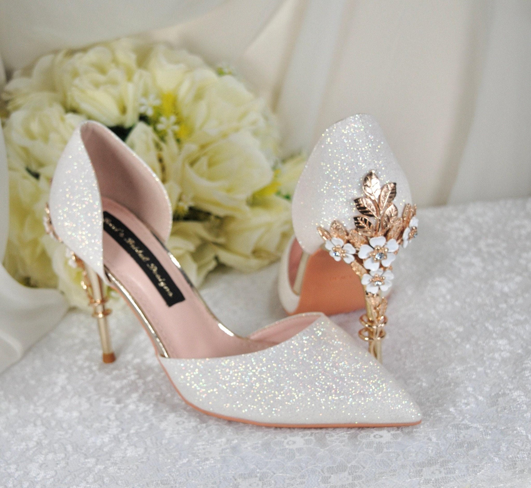 Ivory shimmer heels designed for brides seeking elegance and comfort on their special day. These handmade bridal satin shoes feature exquisite gold detail and delicate cherry blossom heels, crafted to enhance your wedding look while providing all-day comfort. The pointed toe court shoes in size UK7 / US9.5 combine style with practicality, ensuring a perfect fit through precise bridal shoe measurements.