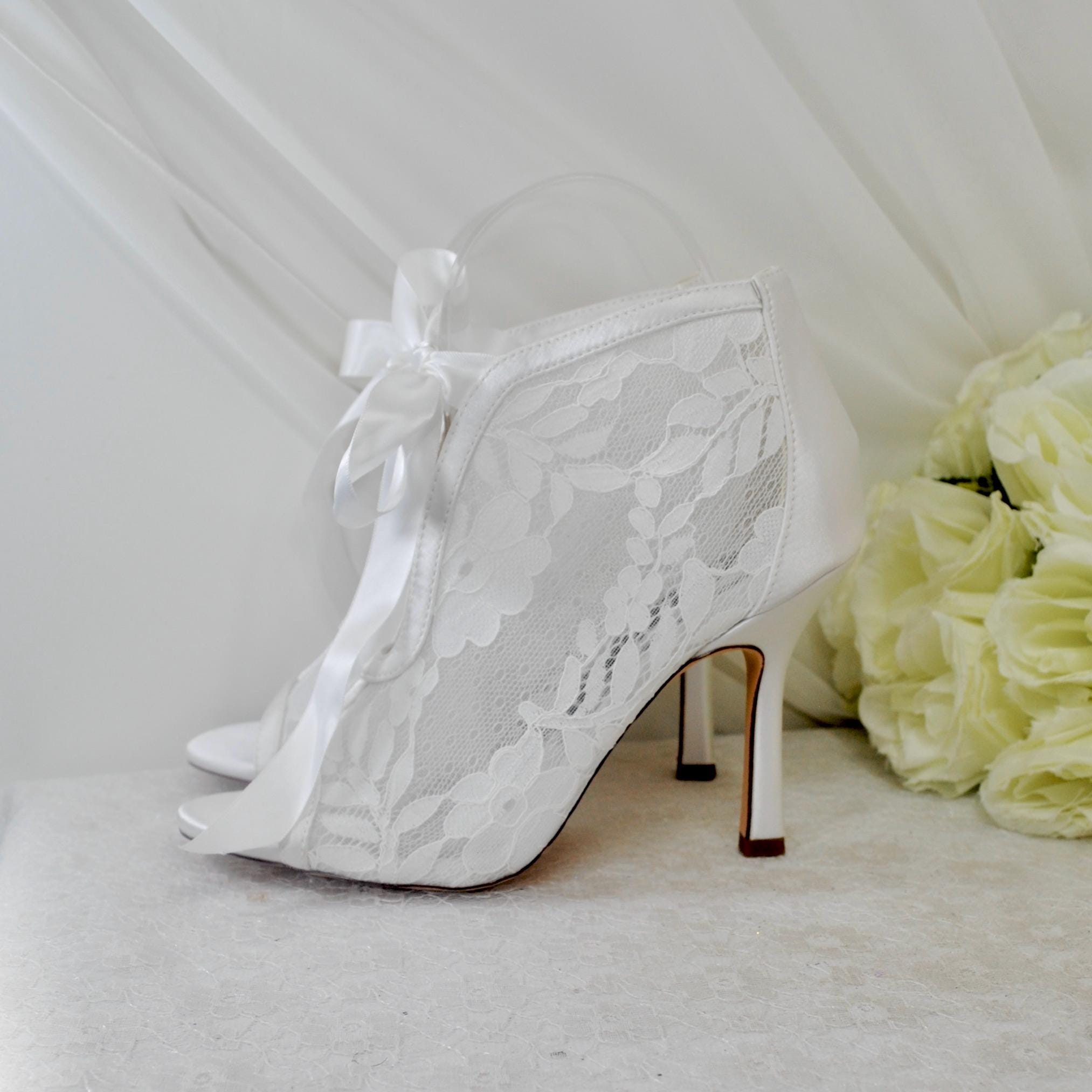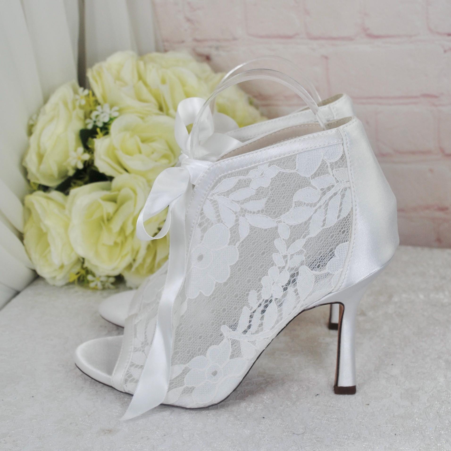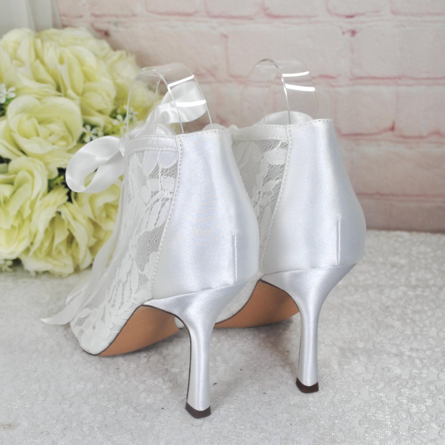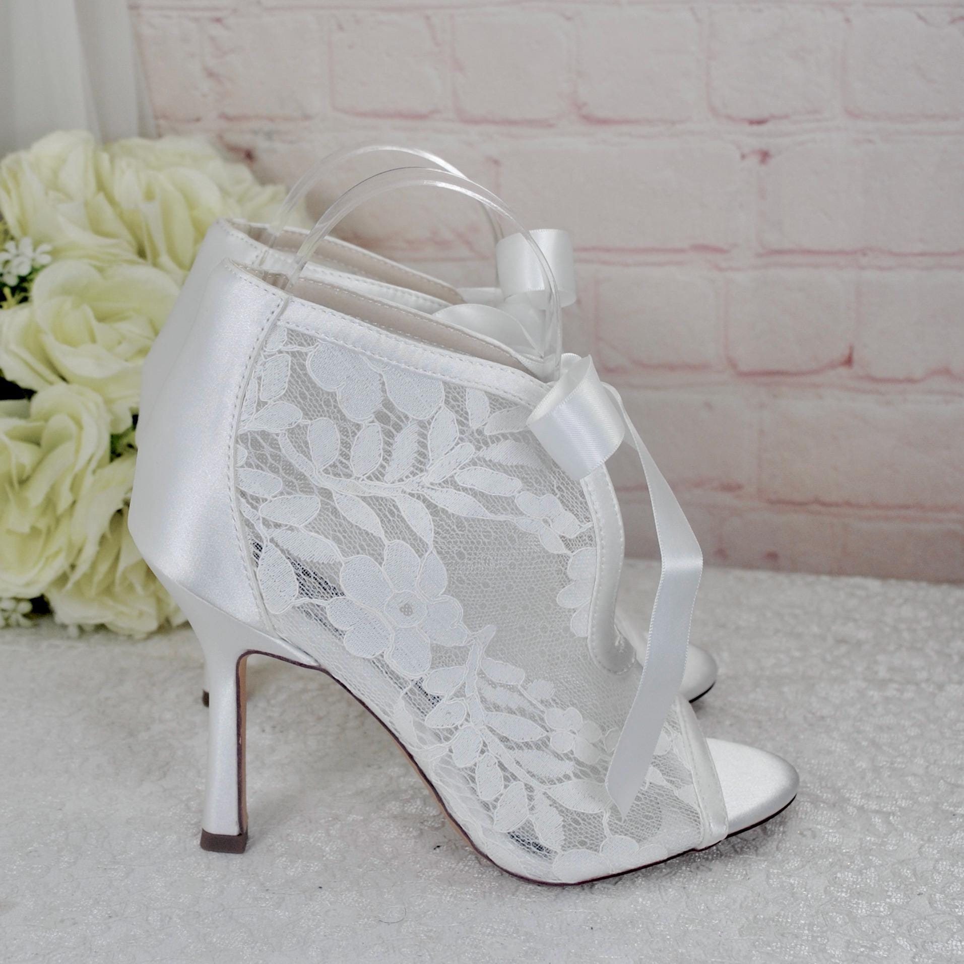 White Lace Wedding Booties with Floral Appliqué & Ribbon Tie are exquisite lace wedding booties designed to provide brides with comfortable bridal footwear that blends vintage charm and modern elegance. These lace wedding booties feature breathable mesh to keep your feet cool and satin ribbon ties that secure the fit while adding a romantic lace-up finish. Handmade with delicate floral appliqué, these ivory wedding shoes offer a unique alternative to classic bridal heels, perfect for brides seeking Victorian wedding boots or boho bridal boots for country wedding footwear.