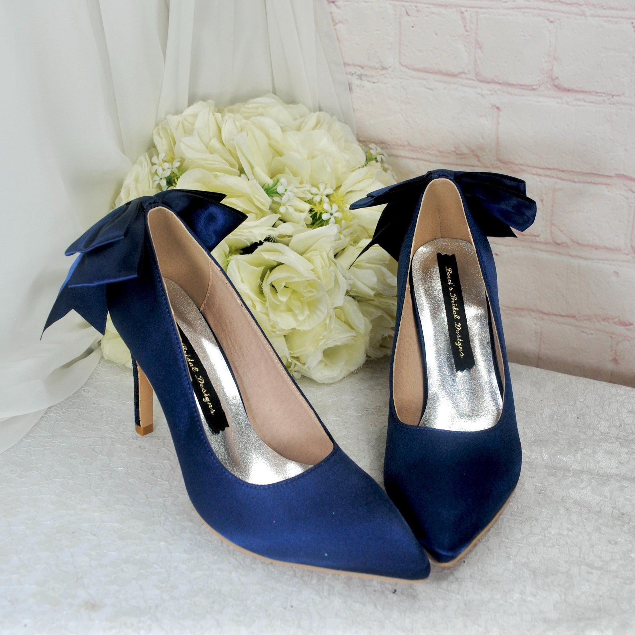 Navy satin heels designed for brides and wedding guests combine elegance with comfort to ensure you look stunning all day. These Navy Satin Stiletto Heels feature a 9cm stiletto heel and sparkling bow detailing, offering a perfect balance of style and sophistication for your special occasion. Handmade satin shoes crafted with padded sole shoes provide bridal shoe comfort, making every step feel light and supported.