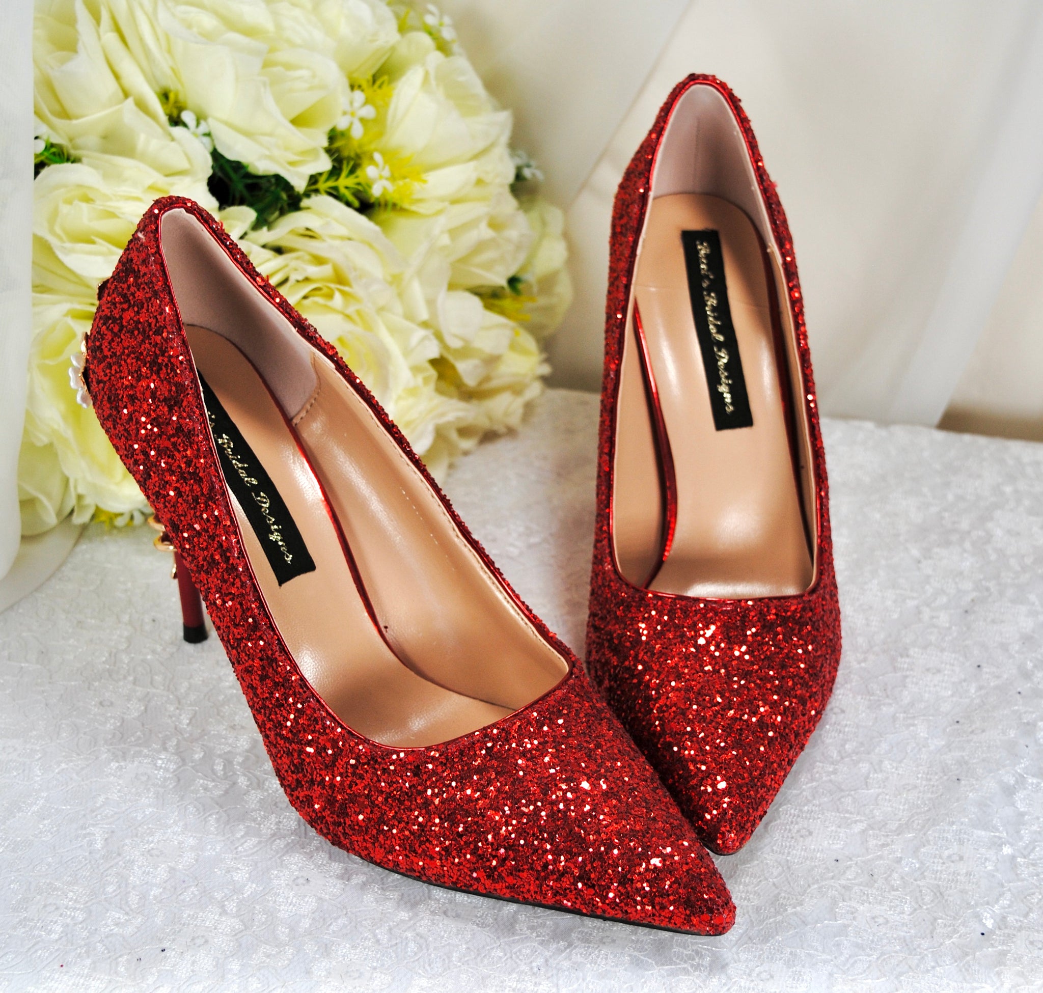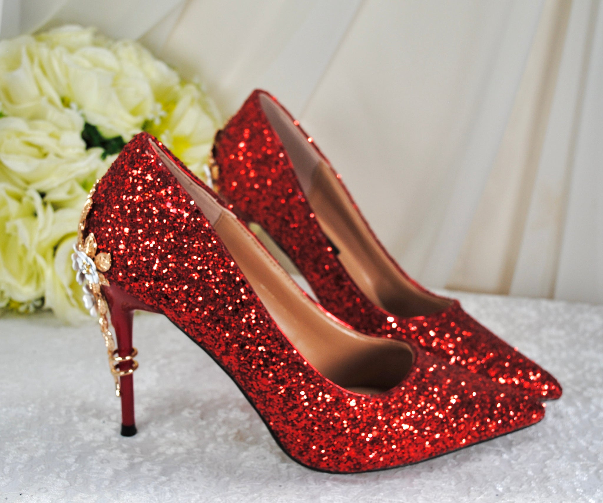 A pair of red glitter high-heeled shoes with gold floral embellishments, placed on a white surface with a bouquet of white roses in the background.