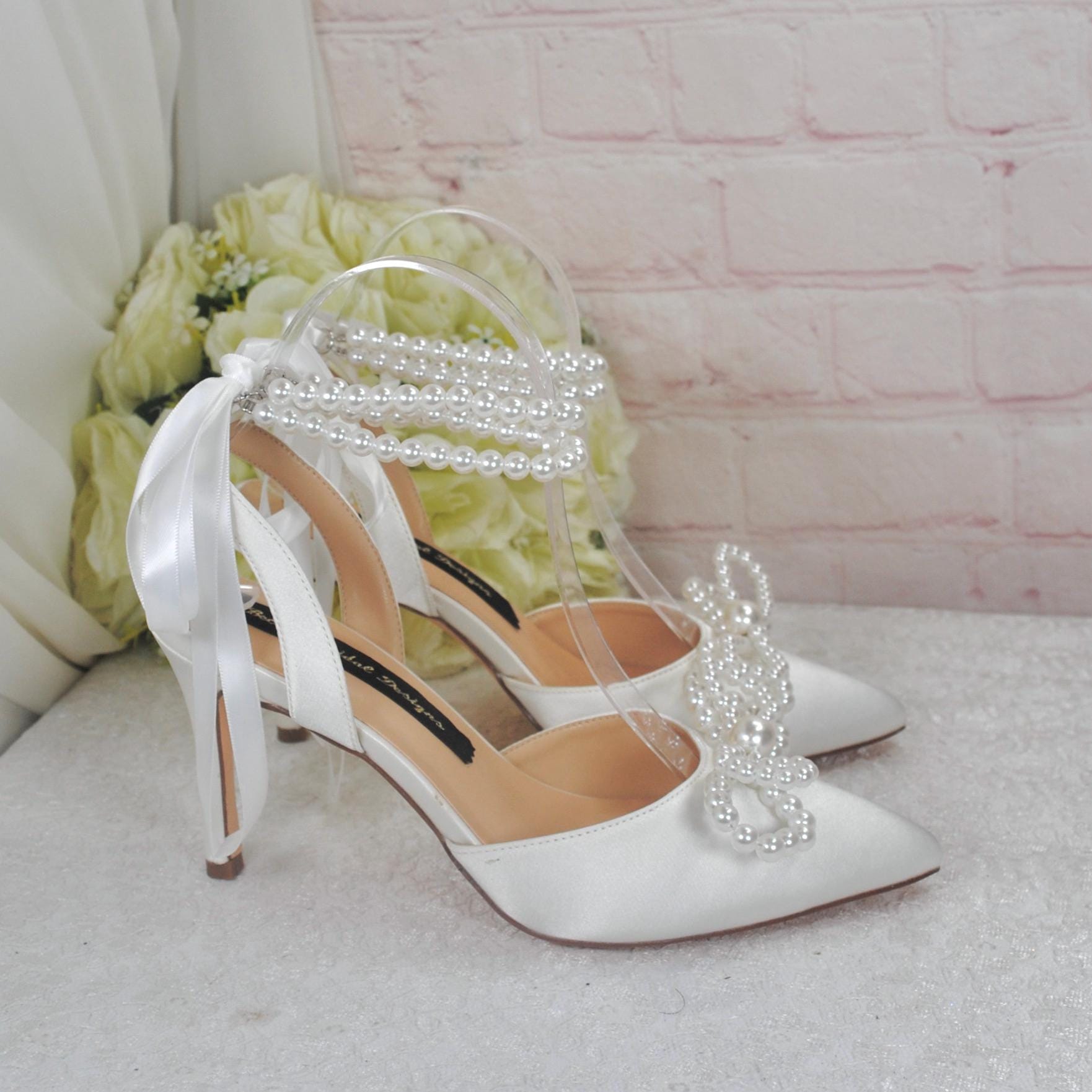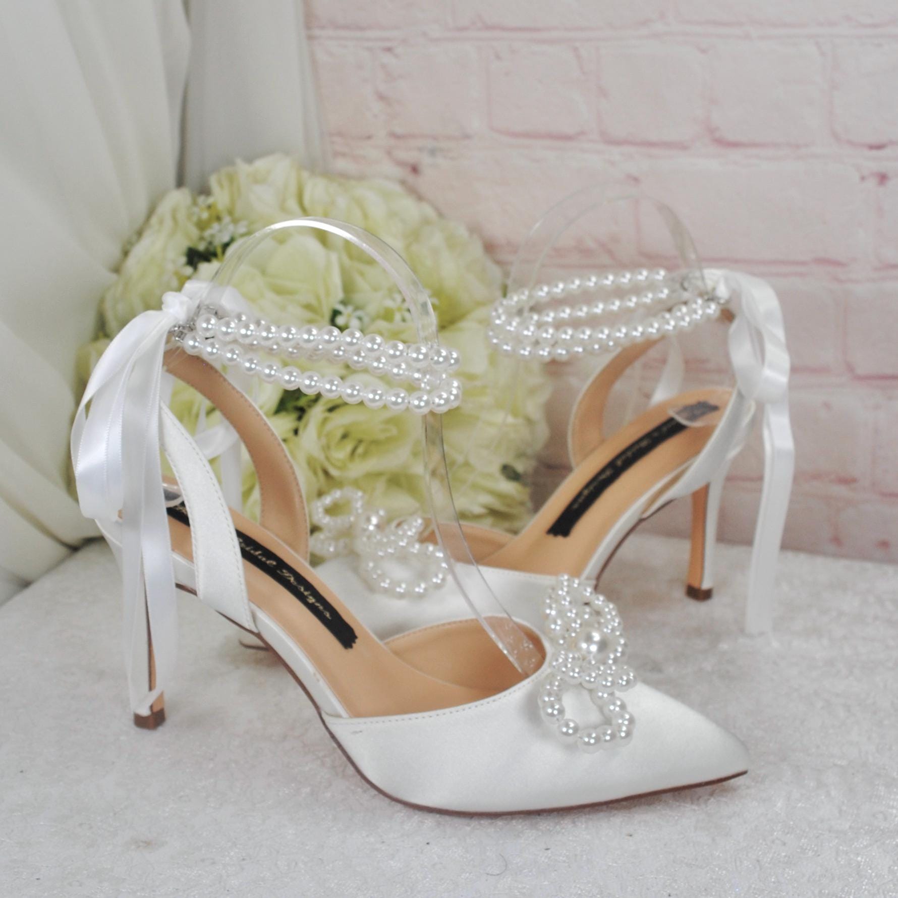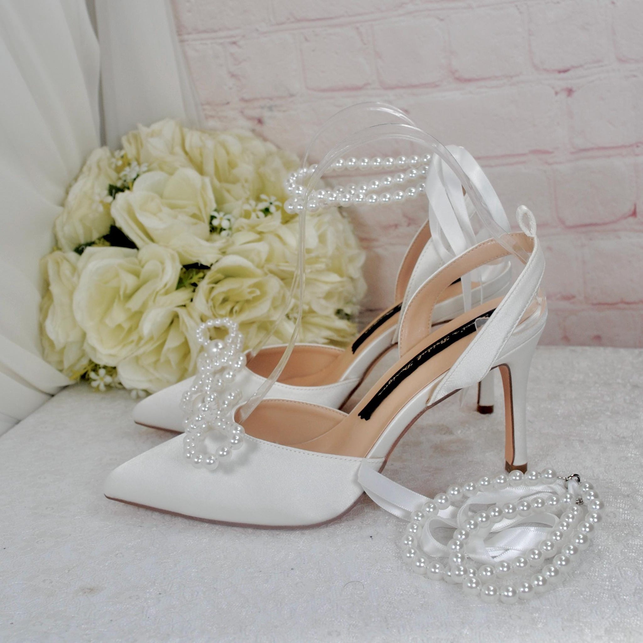 Our satin slingback sandals are the perfect bridal satin shoes designed to combine elegance and comfort for your special day. Featuring 3.3-inch (8.5 cm) heels and a removable ankle strap, these pearl bow heels offer versatility, allowing you to switch effortlessly between a secure fit and a sleek slingback look. The D’Orsay cut shoes highlight your foot's natural shape while the cushioned insole shoes provide all-day comfort, making them comfortable wedding heels you can trust.