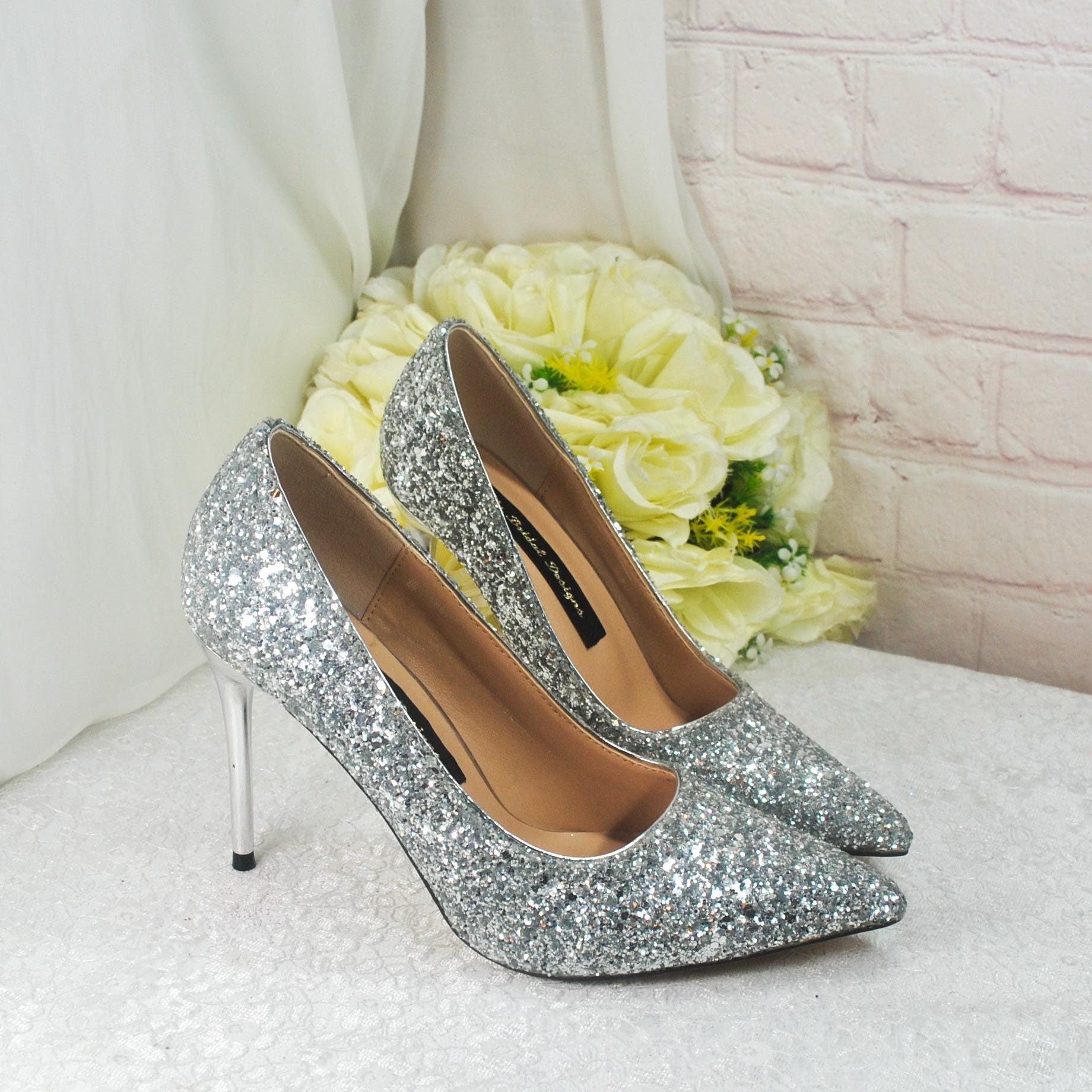 Silver glitter bridal heels designed to elevate your wedding day look while ensuring comfort and style. These pointed toe stilettos offer a stunning silhouette with a 9cm heel, crafted to provide the perfect balance between elegance and wearability. Handmade from high-quality satin and glitter materials, these bridal stiletto shoes deliver sparkling wedding shoes that catch the light beautifully, making you shine on your special day.