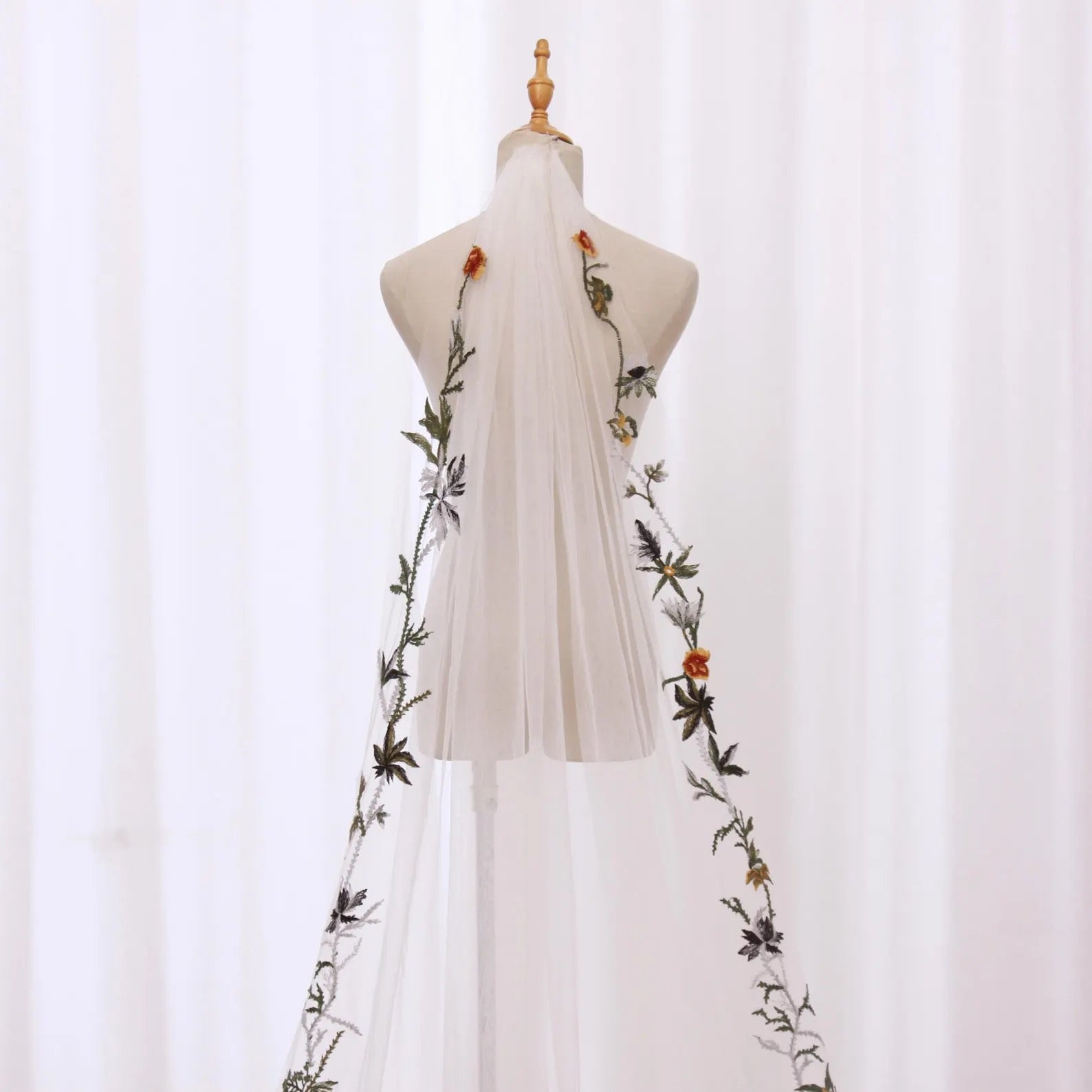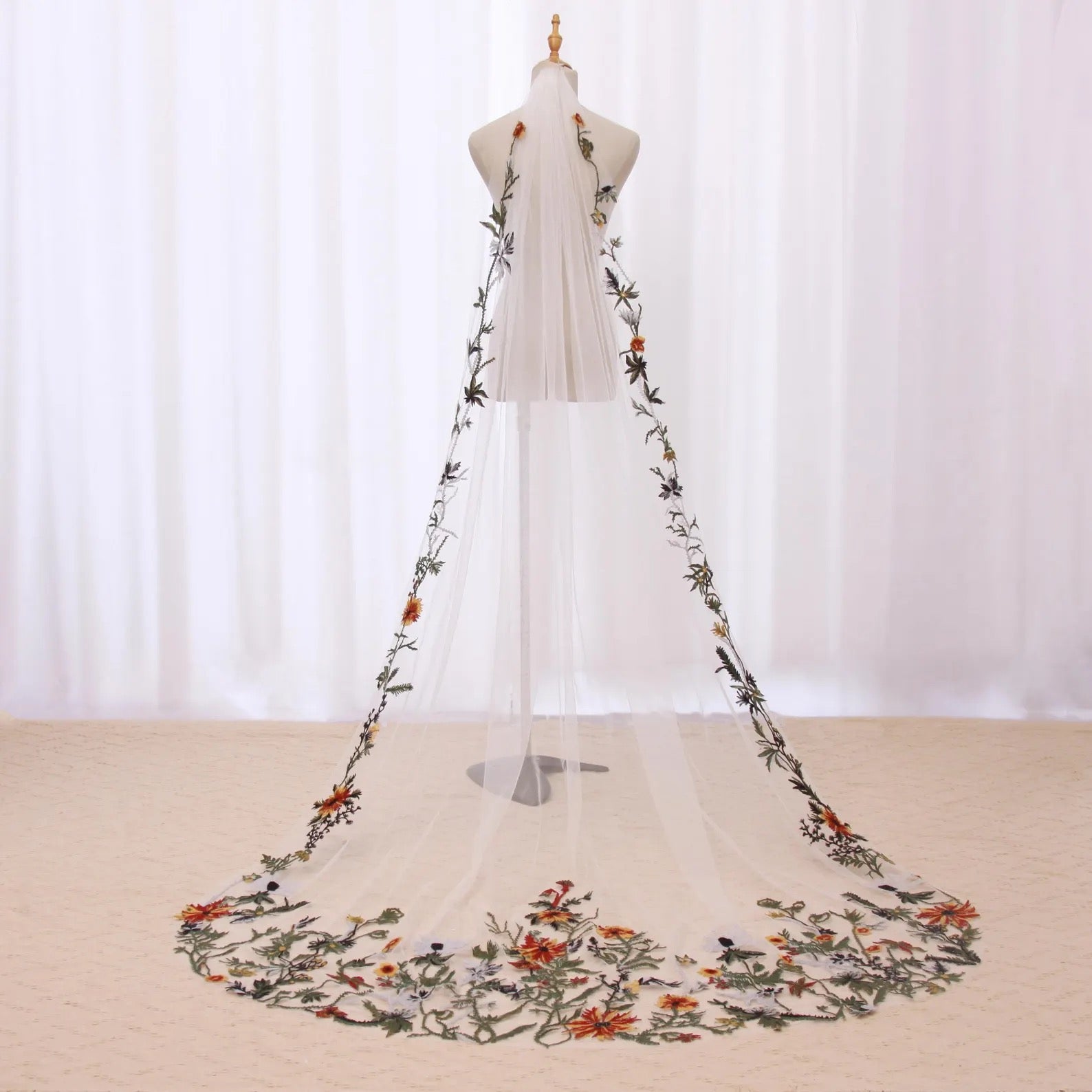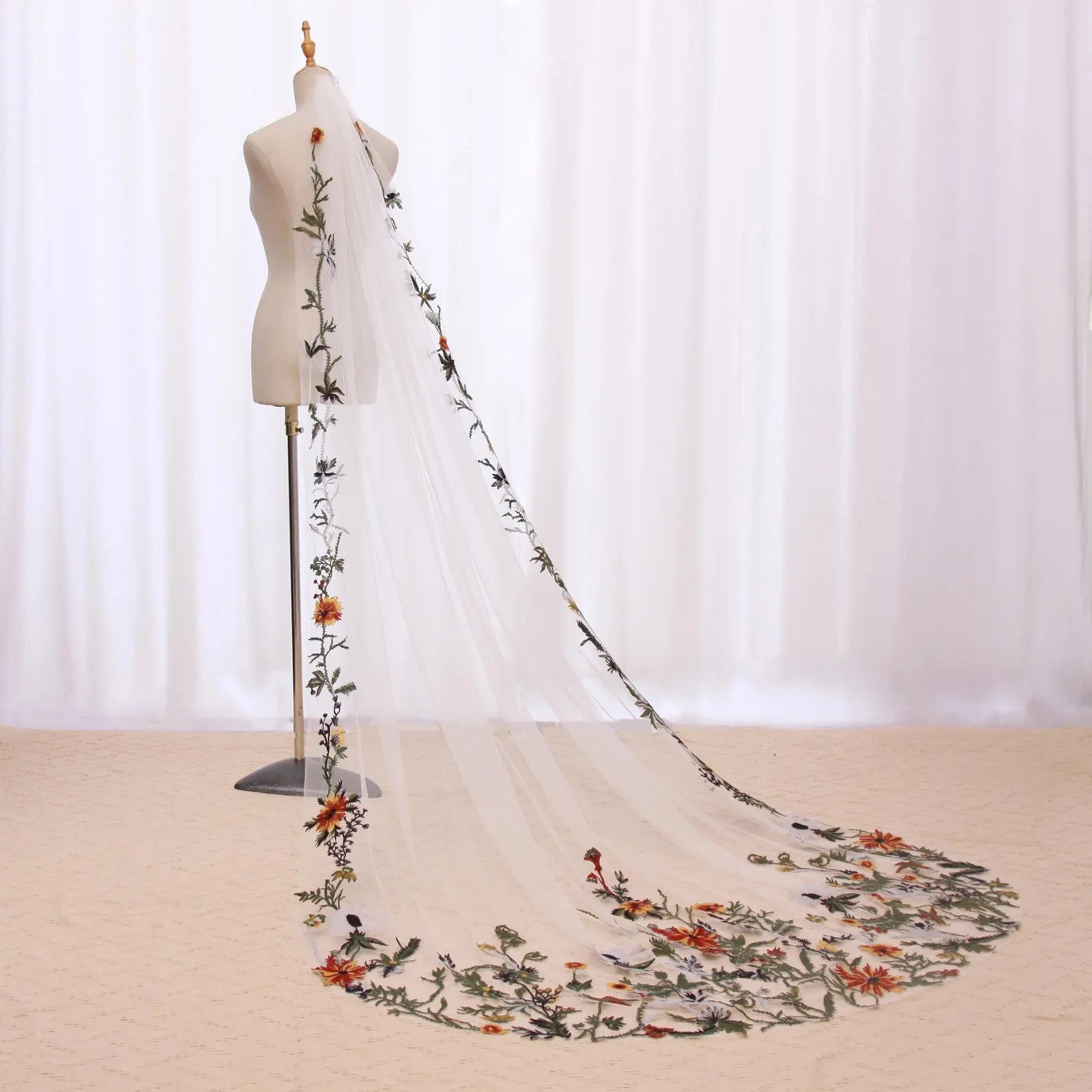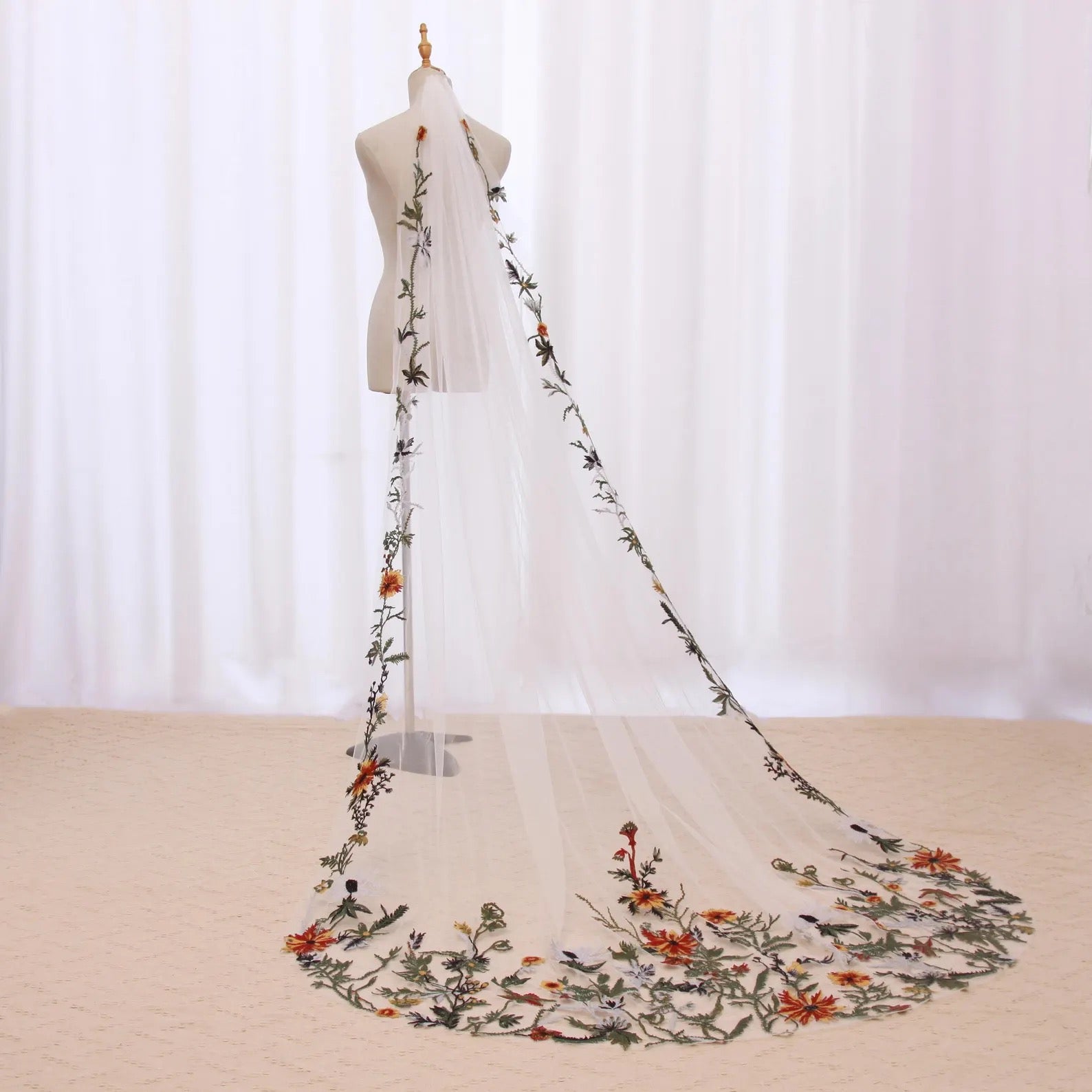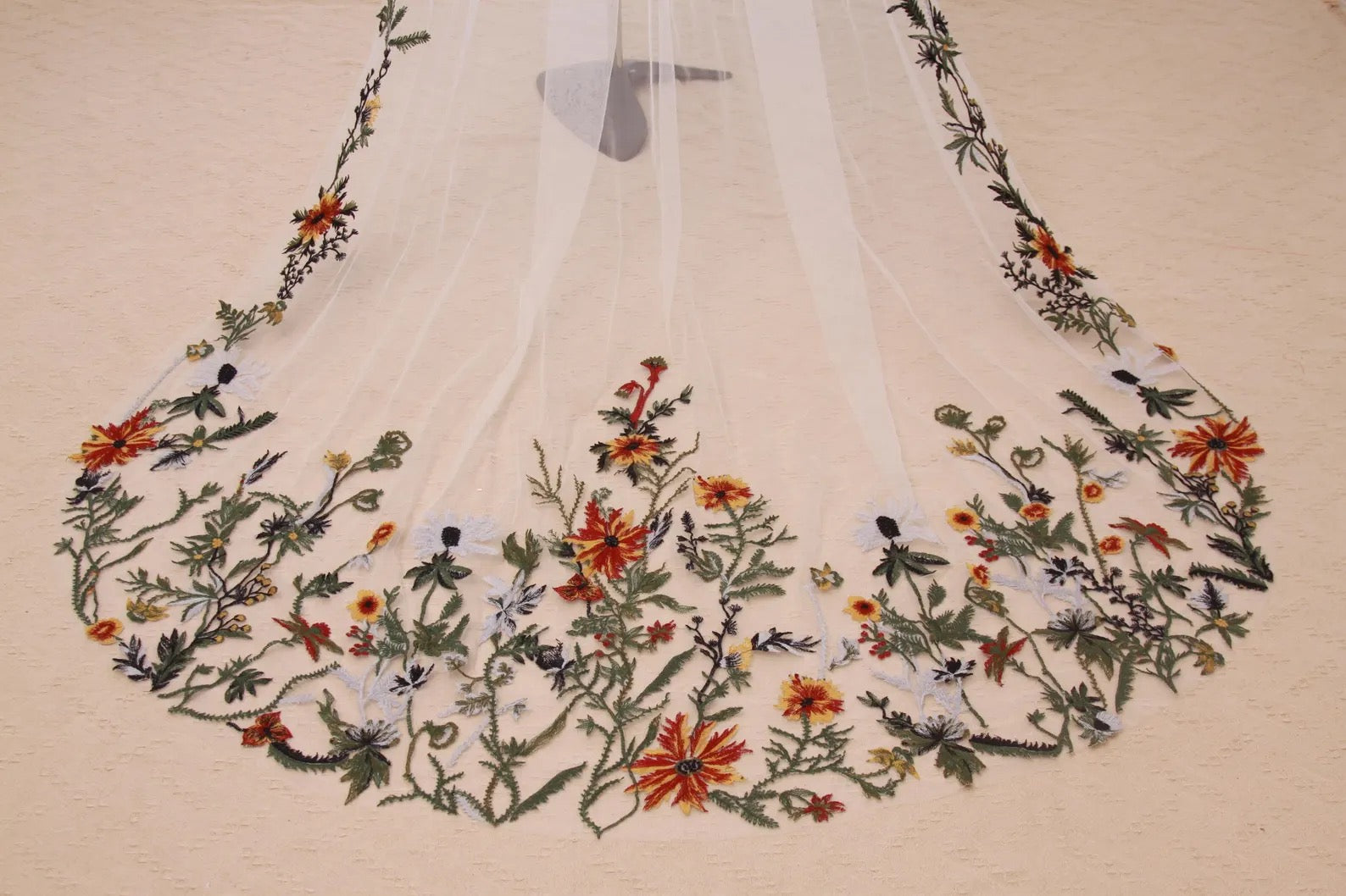 Delicate white bridal veil adorned with an exquisite floral embroidery that spans the entire length of the piece. The intricate floral pattern, featuring a variety of colors and shades, adds an element of sophistication and uniqueness. This delicate embroidery imparts a sense of elegance, tenderness, and freshness to the feminine look.