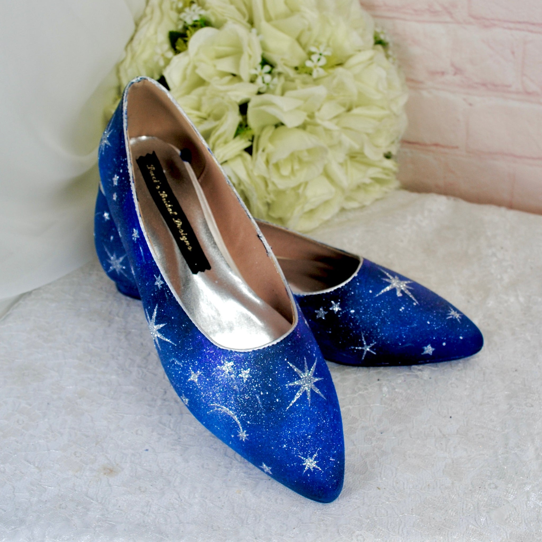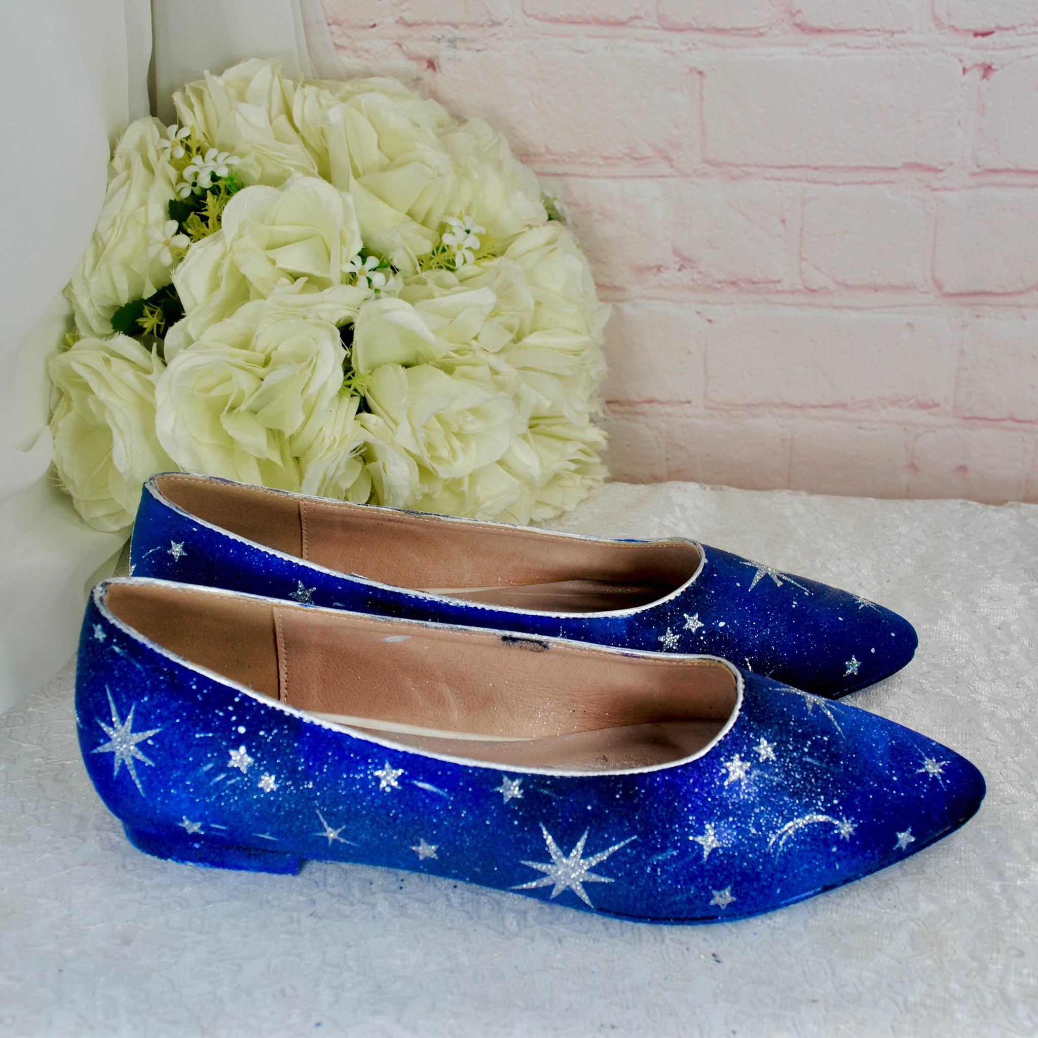 Discover our hand painted bridal shoes, expertly crafted to combine elegance and comfort for your special day. These satin ballet flats feature a stunning galaxy pattern with silver star shoes hand painted onto soft blue satin, delivering unique custom wedding shoes that make a memorable statement. Designed as flat bridal shoes with pointed toe flats, they provide comfortable bridal flats ideal for hours of wear without sacrificing style.