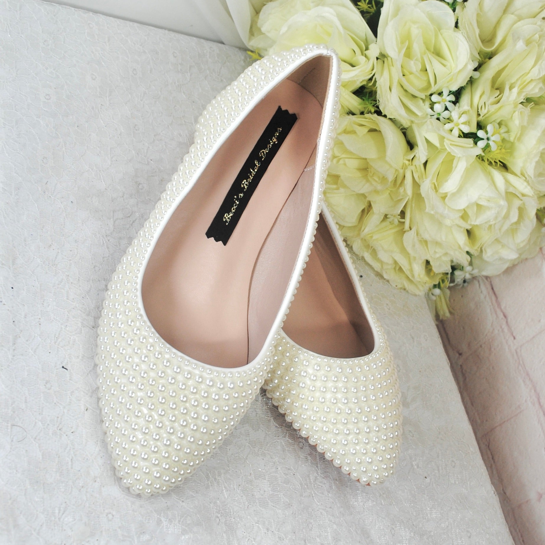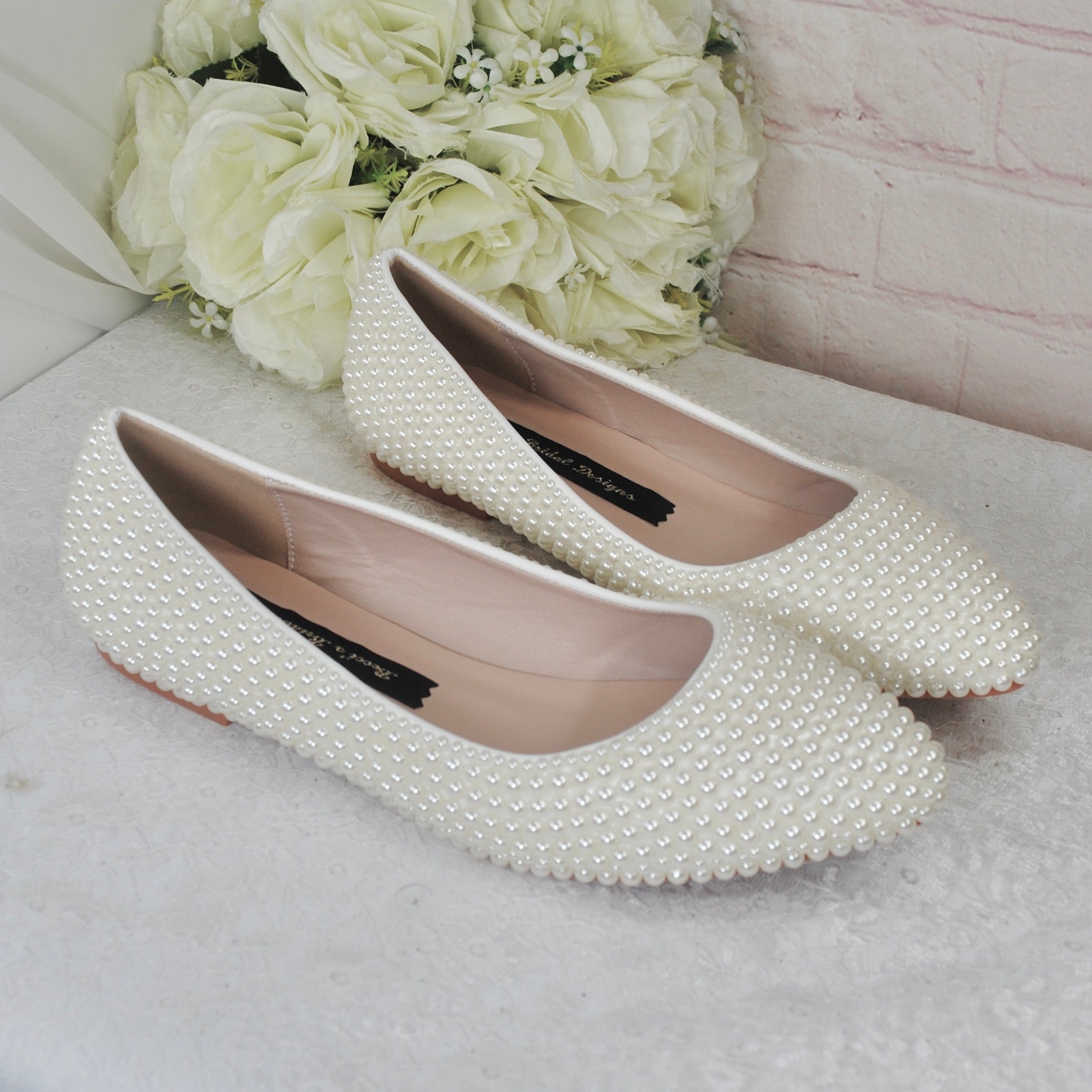 Beautifully handmade bridal shoes, these flat wedding shoes are embellished with ivory or white pearls creating beautiful pearl wedding shoes, the perfect comfortable shoes for bride.