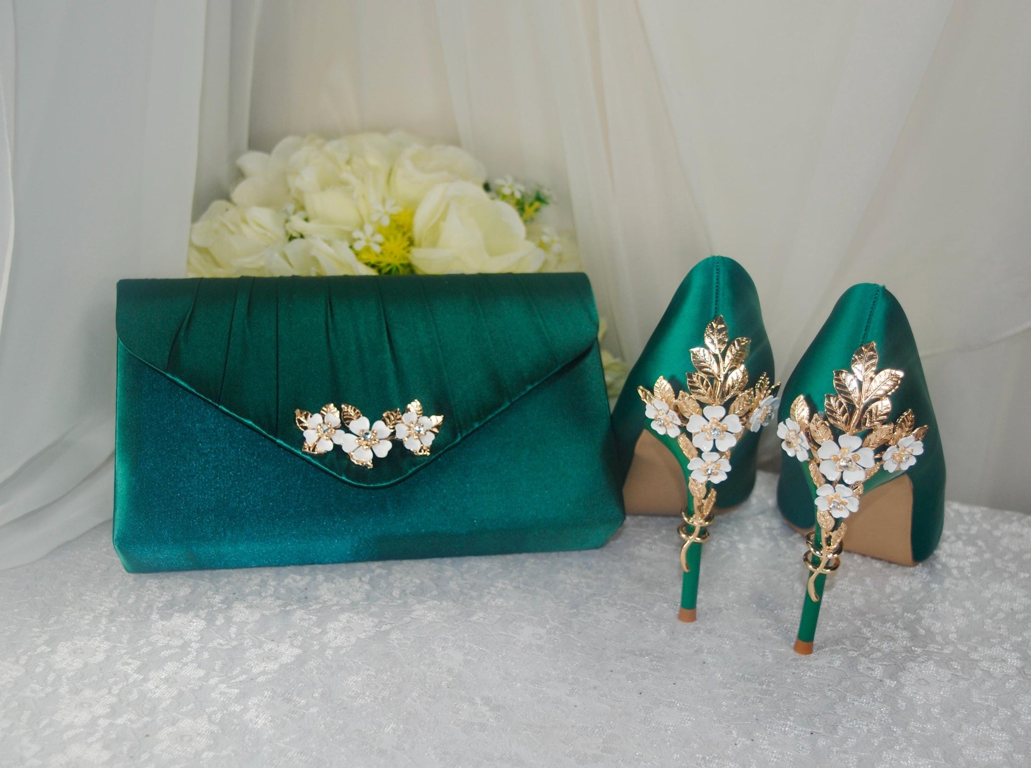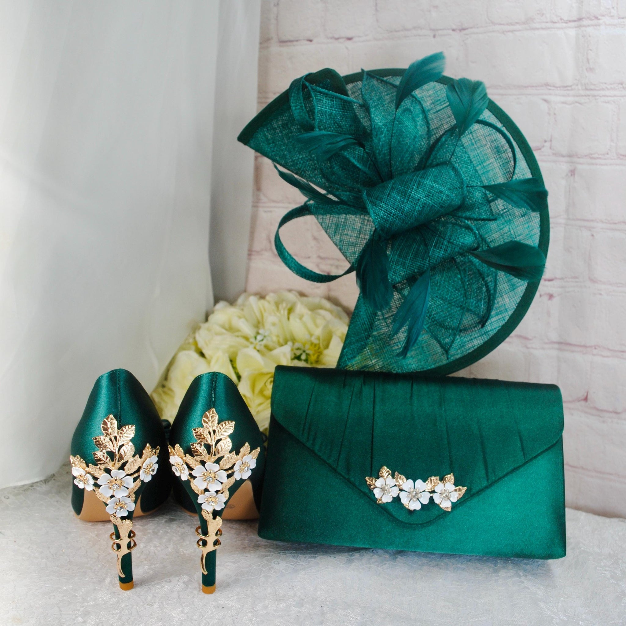 A prefect matching set of High Quality Handmade Satin Shoes, Handbag and Fascinator, ideal for Race Days, Wedding Guests, Prom, Bridal Parties, Mother of the Bride or Groom