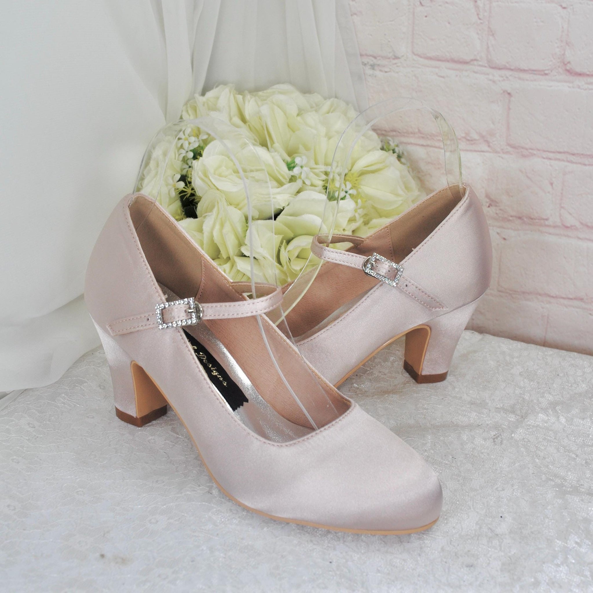 A beautifully handmade satin bridal shoes. These stunning shoes have a comfortable 7cm block heel and secure strap