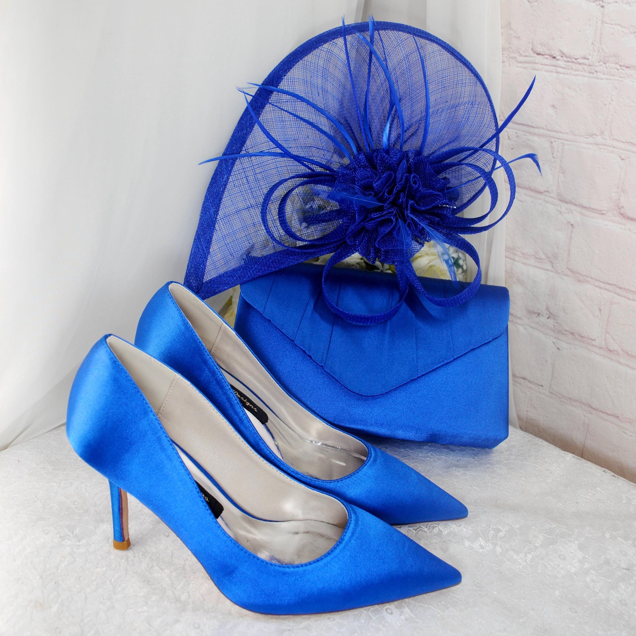 A prefect matching set of High Quality Handmade Satin Shoes, Handbag and Fascinator, ideal for Race Days, Wedding Guests, Prom, Bridal Parties, Mother of the Bride or Groom