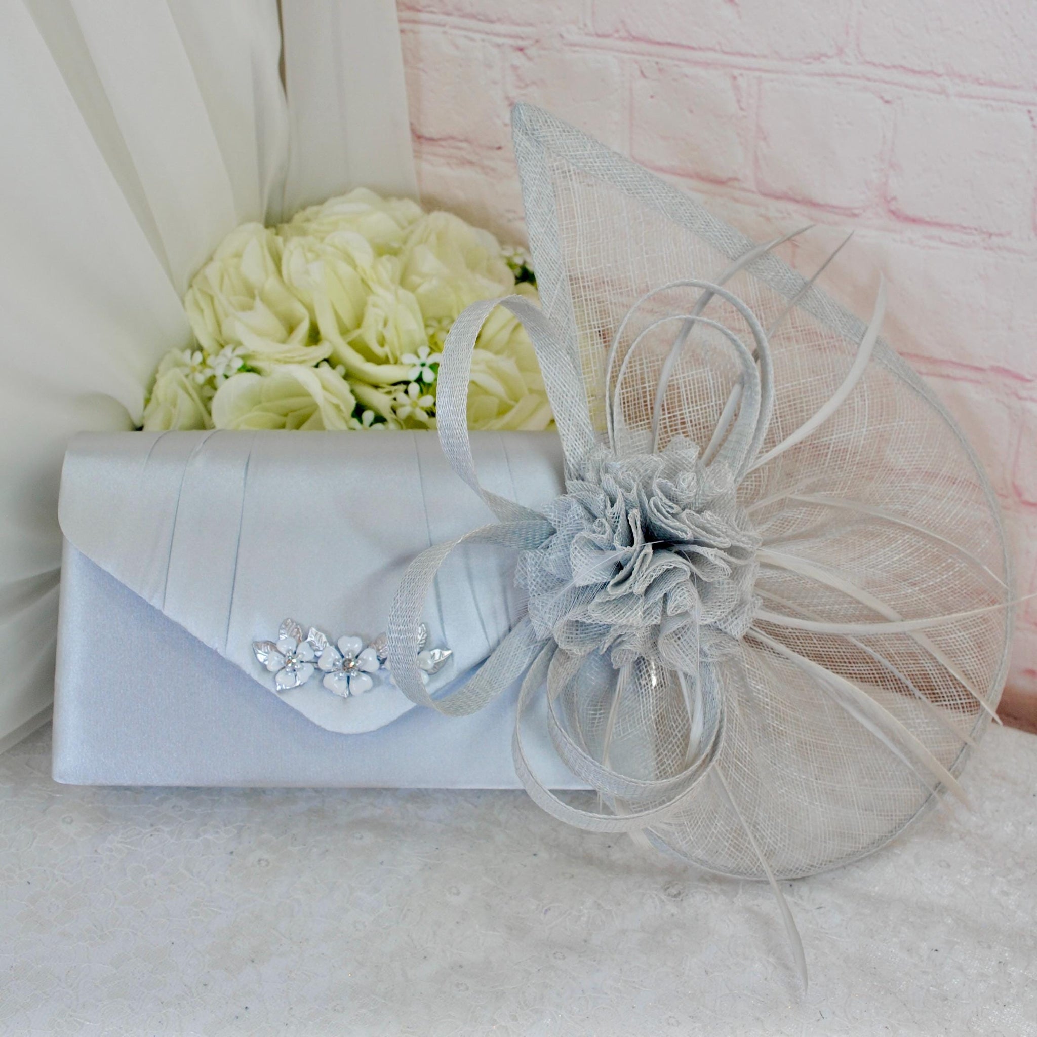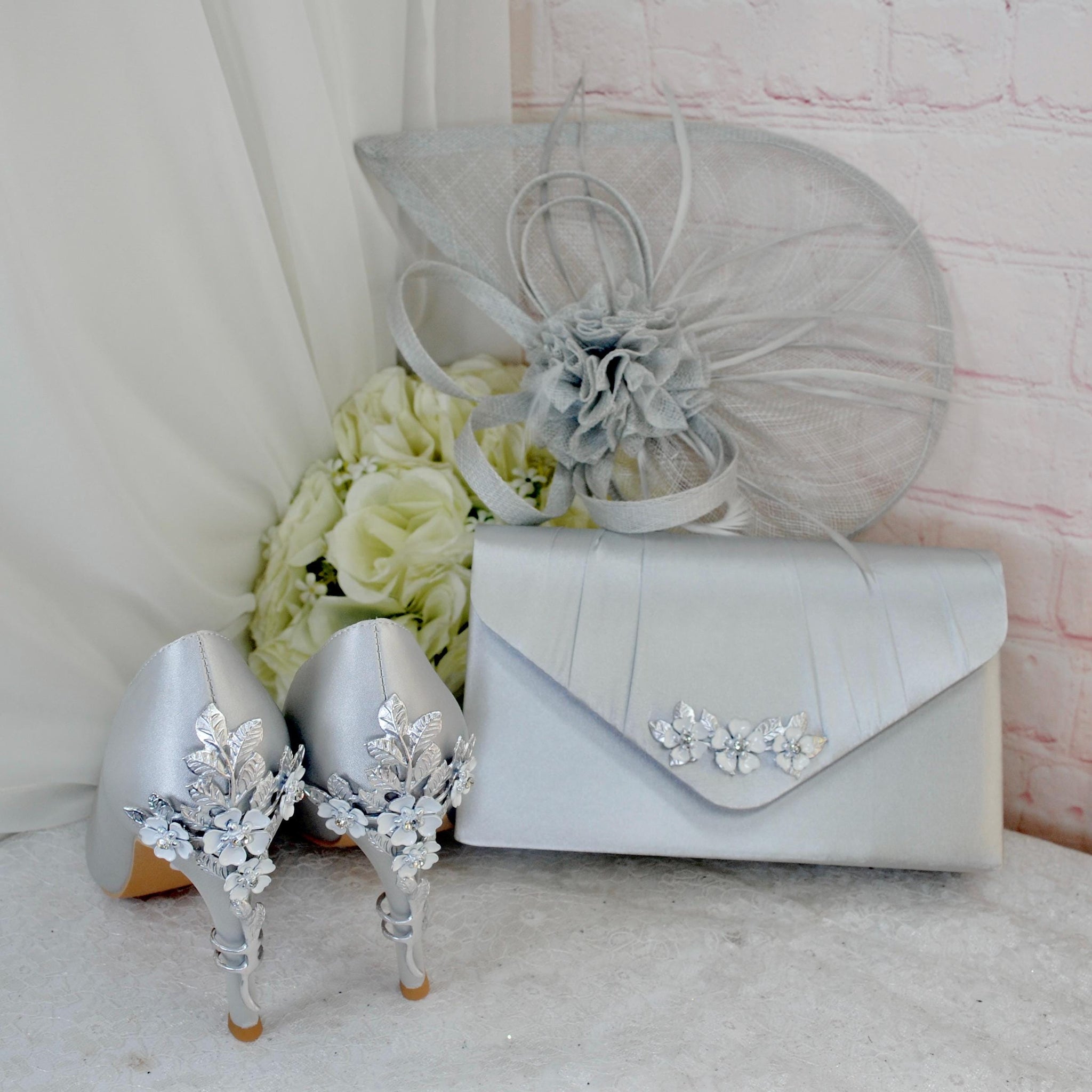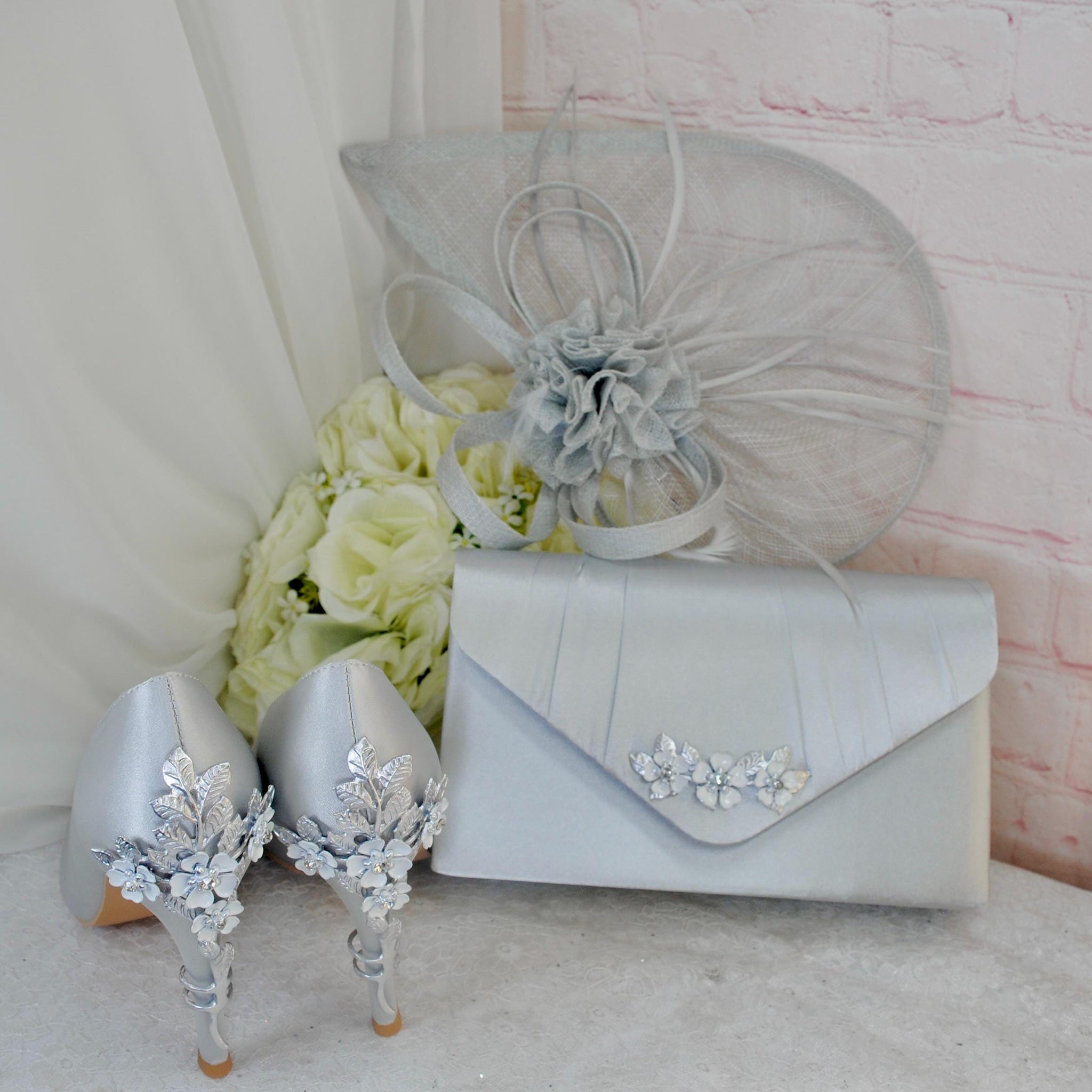 A prefect matching set of High Quality Handmade Satin Shoes, Handbag and Fascinator, ideal for Race Days, Wedding Guests, Prom, Bridal Parties, Mother of the Bride or Groom