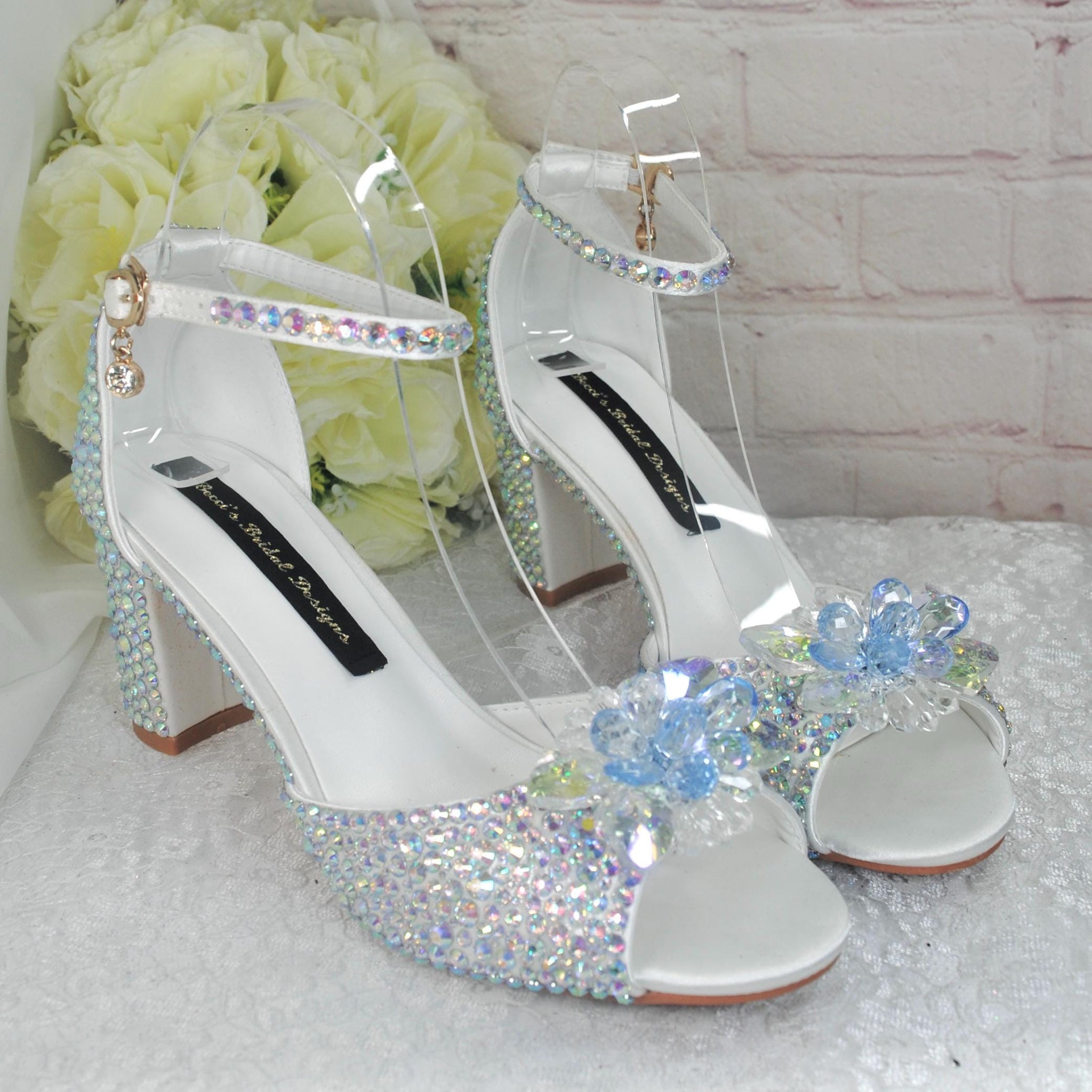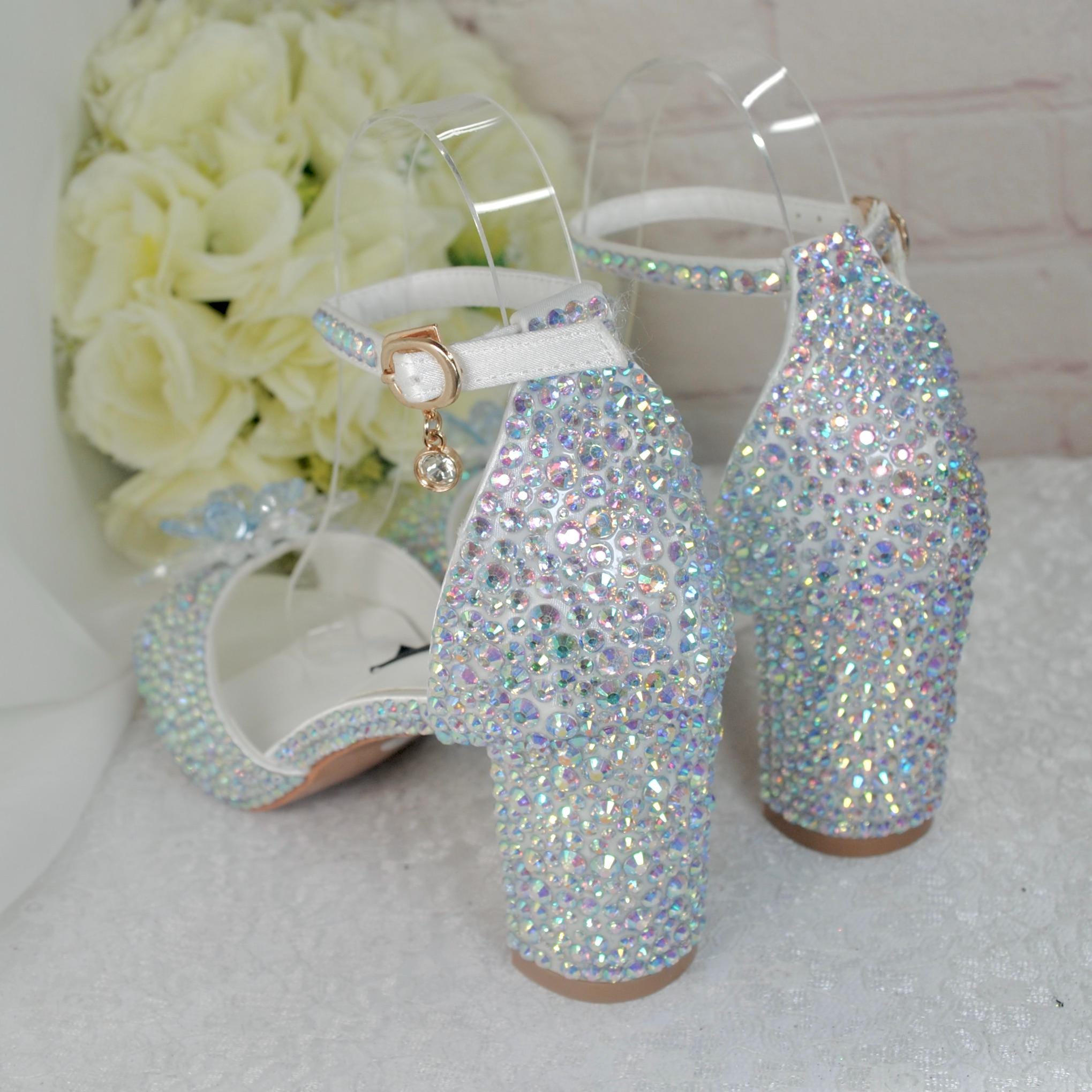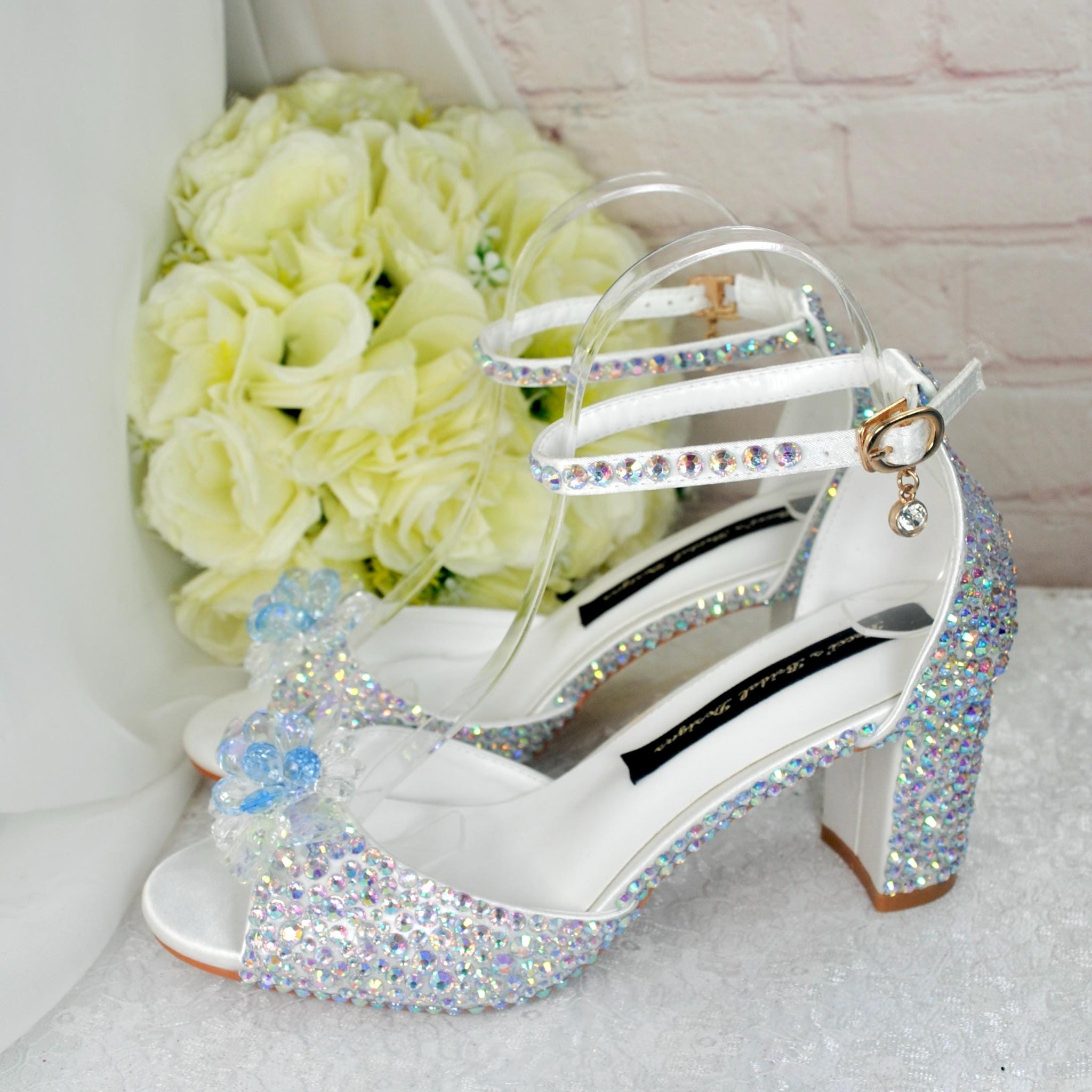 Beautiful Cinderella Crystal Bridal Shoes. A comfortable block heel adorned with crystals and finished with a Swarovski Crystal Flower Brooch.