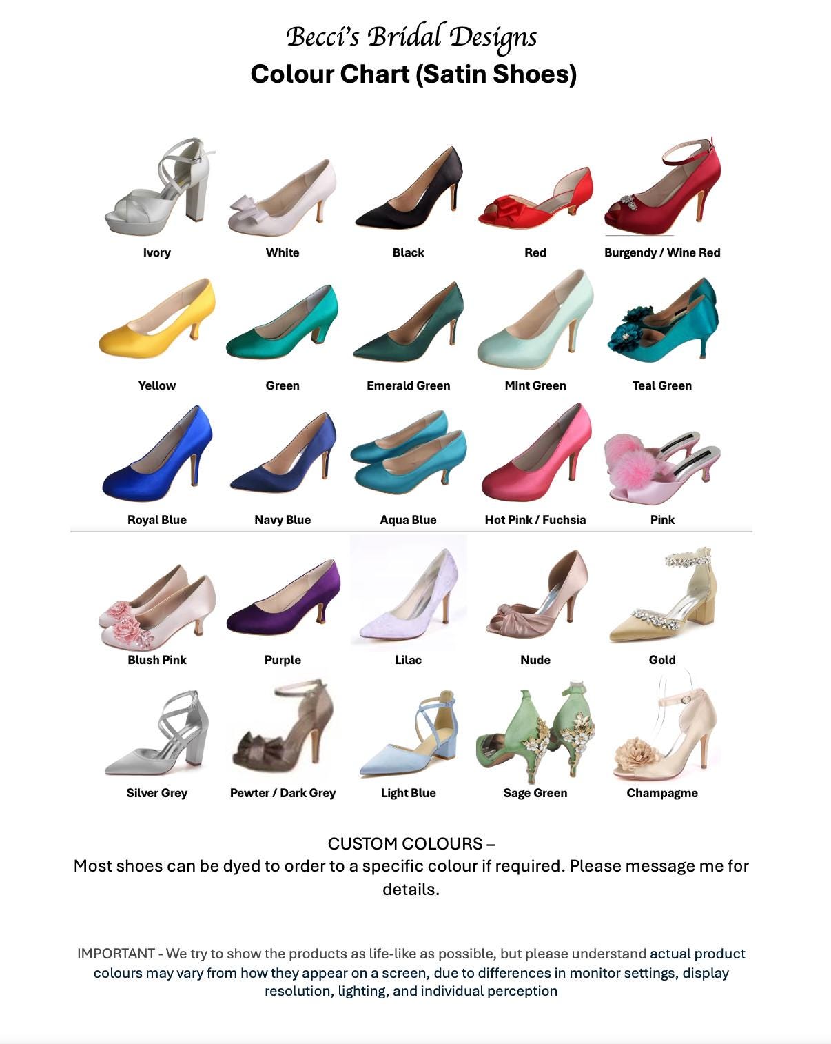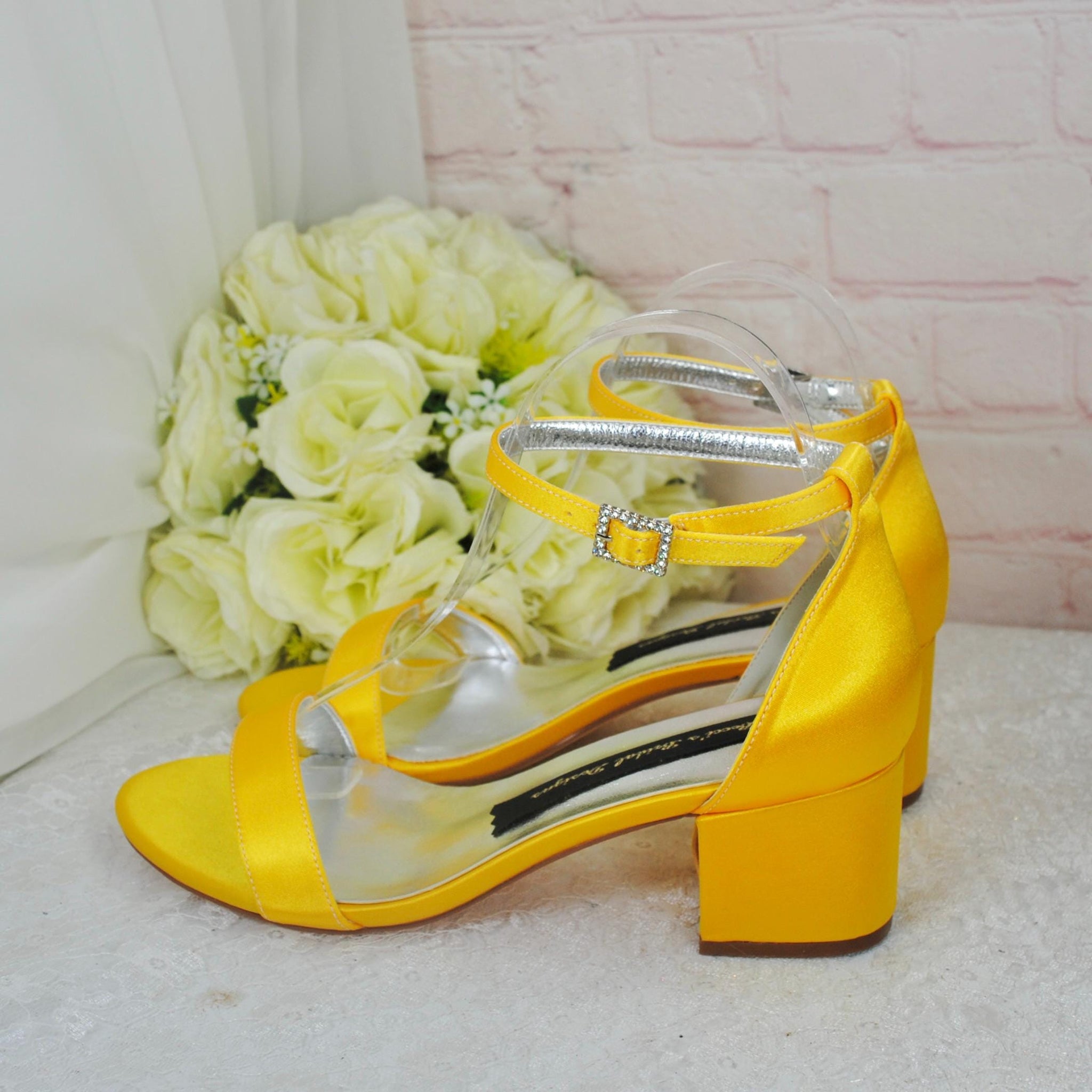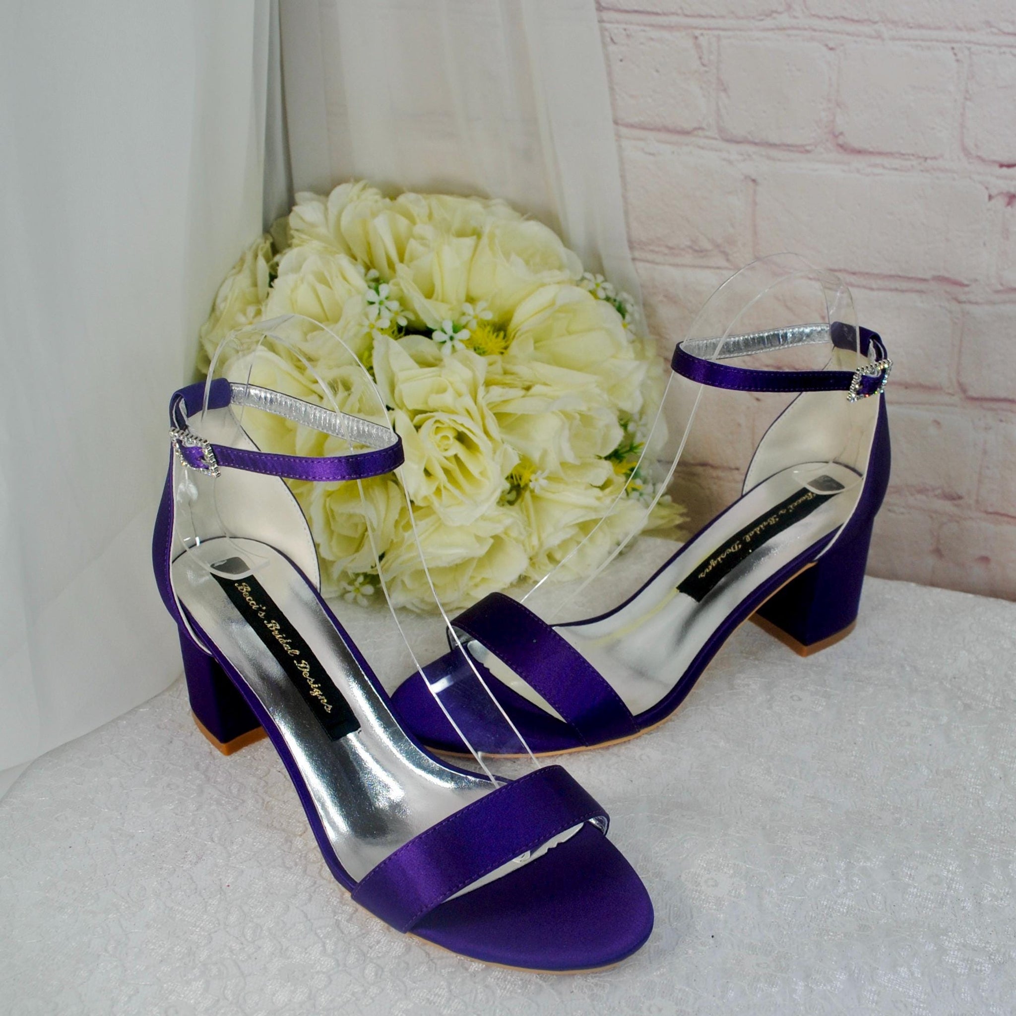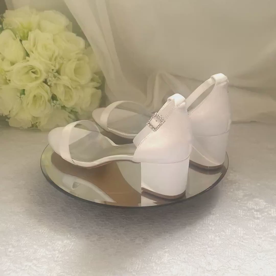 Beautifully handmade bridal shoes. A satin wedding shoe made with extra padded soles for comfortable 12 hour wear. A low block heel with ankle strap, these custom shoes come in a wide range of colours. The perfect shoes for bride, bridesmaids, maid of honour, mother of the bride, evening shoes and special occasions.